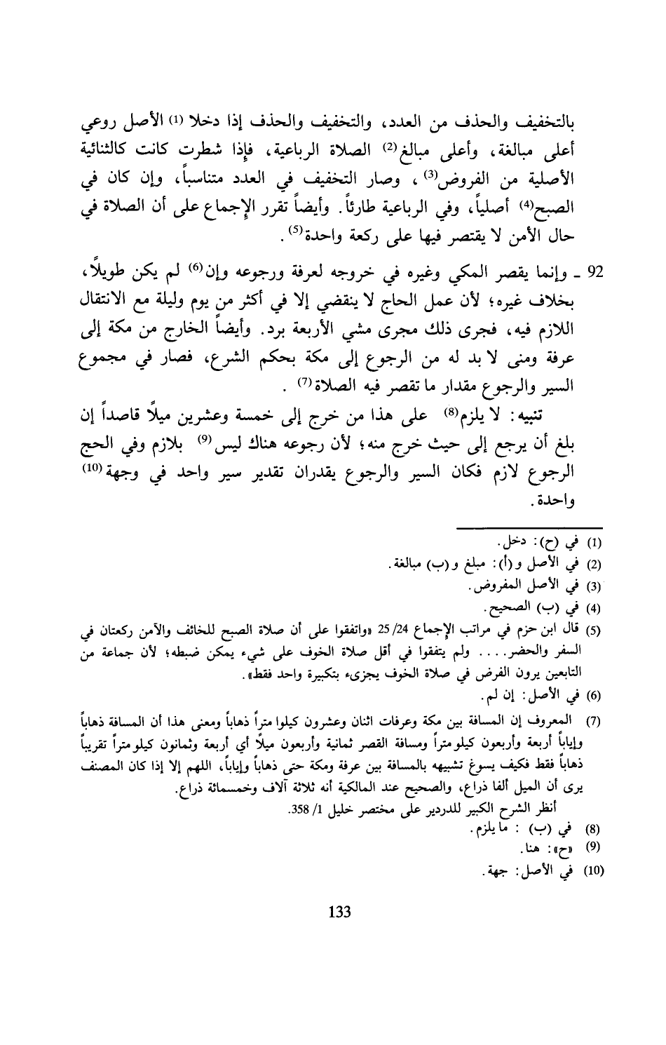 (¬7) المعروف إن المسافة بين مكة وعرفات اثنان وعشرون كيلوا مترًا ذهابًا ومعنى هذا أن المسافة ذهابًا وإيابًا أربعة وأربعون كيلو مترًا ومسافة القصر ثمانية وأربعون ميلًا أي أربعة وثمانون كيلو مترًا تقريبًا ذهابًا فقط فكيف يسوغ تشبيهه بالمسافة بين عرفة ومكة حتى ذهابًا وإيابًا، اللهم إلا إذا كان المصنف يرى أن الميل ألفا ذراع، والصحيح عند المالكية أنه ثلاثة آلاف وخمسمائة ذراع.