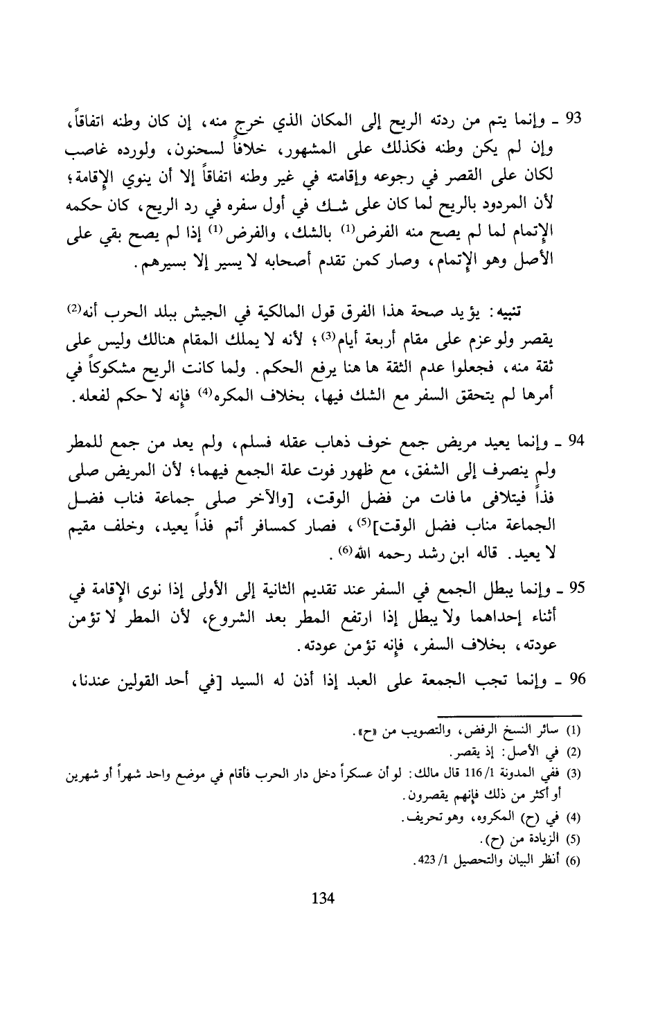 93 - وإنما يتم من ردته الريح إلى المكان الذي خرج منه، إن كان وطنه اتفاقًا، وإن لم يكن وطنه فكذلك على المشهور، خلافًا لسحنون، ولورده غاصب لكان على القصر في رجوعه وإقامته في غير وطنه اتفاقًا إلا أن ينوي الإِقامة؛ لأن المردود بالريح لما كان على شك في أول سفره في رد الريح، كان حكمه الإِتمام لما لم يصح منه الفرض (1) بالشك، والفرض (¬1) إذا لم يصح بقي على الأصل وهو الإِتمام، وصار كمن تقدم أصحابه لا يسير إلا بسيرهم.