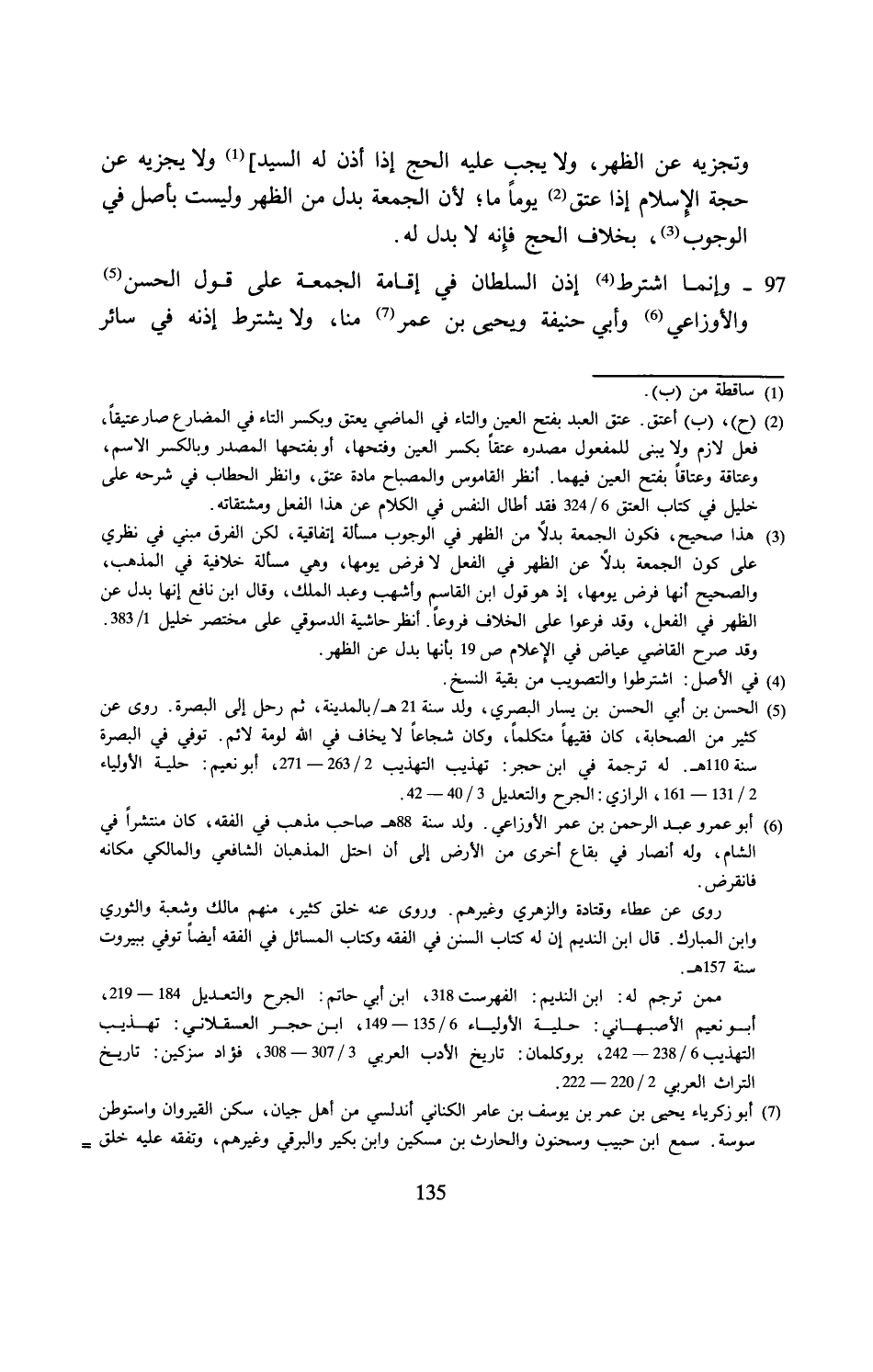 97 - وإنما اشترط (¬4) إذن السلطان في إقامة الجمعة على قول الحسن (¬5) والأوزاعي (¬6) وأبي حنيفة ويحيى بن عمر (¬7) منا، ولا يشترط إذنه في سائر