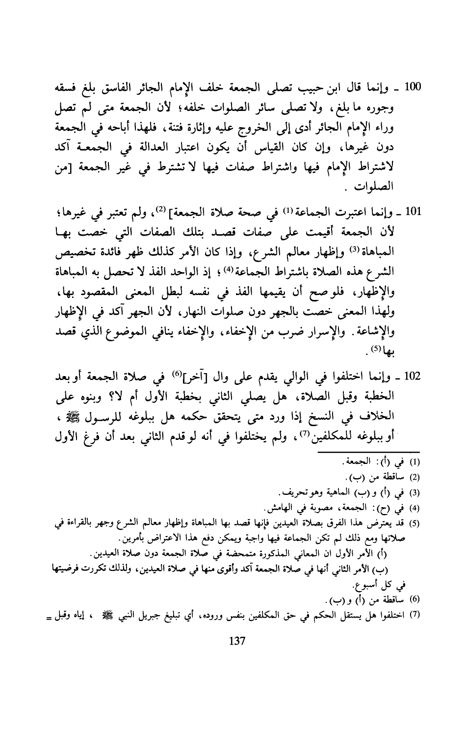 100 - وإنما قال ابن حبيب تصلى الجمعة خلف الإِمام الجائر الفاسق بلغ فسقه وجوره مابلغ، ولا تصلى سائر الصلوات خلفه؛ لأن الجمعة متى لم تصل وراء الإِمام الجائر أدى إلى الخروج عليه وإثارة فتنة، فلهذا أباحه في الجمعة دون غيرها، وإن كان القياس أن يكون اعتبار العدالة في الجمعة آكد لاشتراط الإِمام فيها واشتراط صفات فيها لا تشترط في غير الجمعة [من الصلوات.