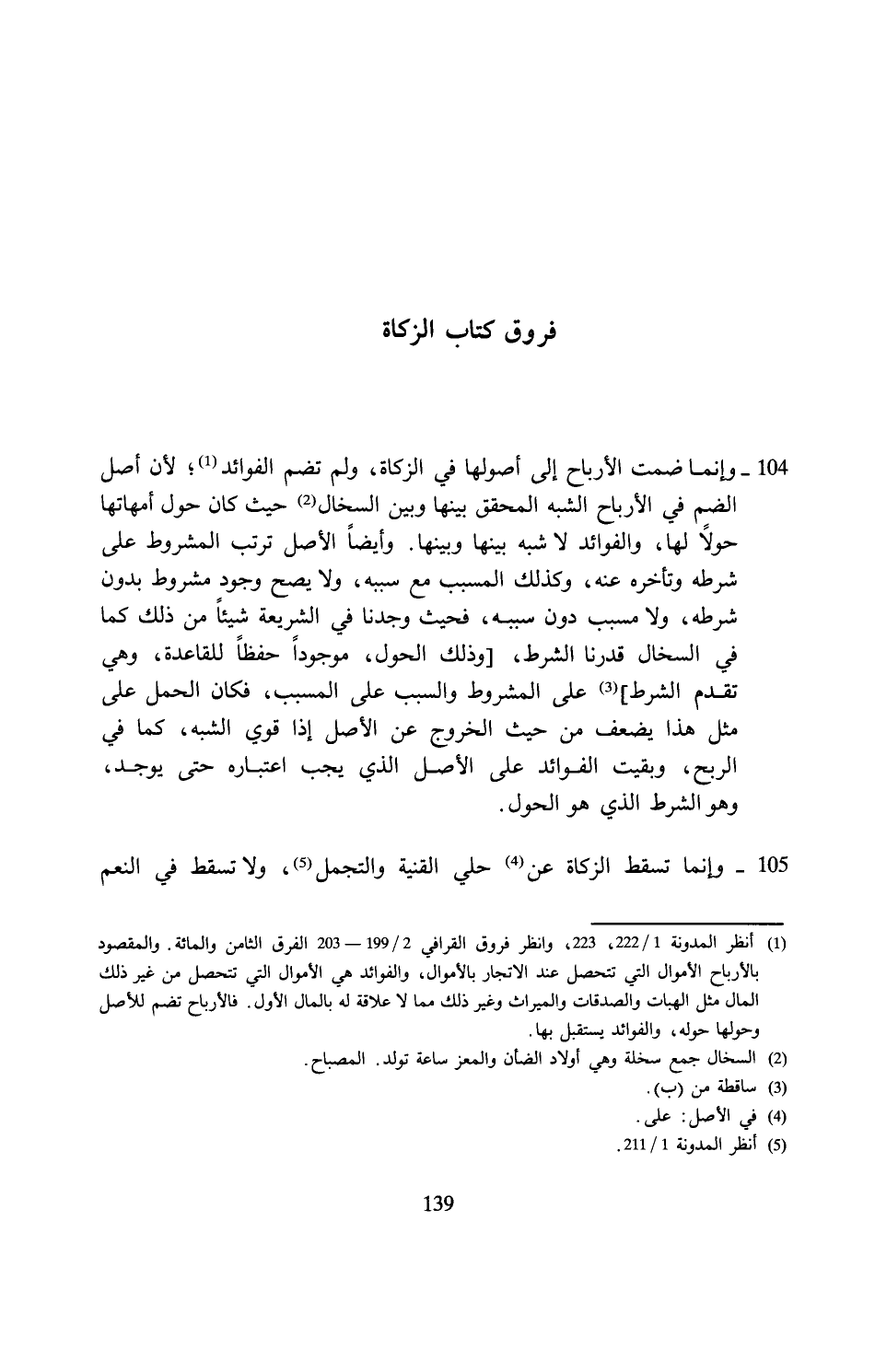 (¬1) انظر المدونة 1/ 222، 223، وانظر فروق القرافي 2/ 199 - 203 الفرق الثامن والمائة. والمقصود بالأرباح الأموال التي تنحصل عند الاتجار بالأموال، والفوائد هي الأموال التي تتحصل من غير ذلك المال مثل الهبات والصدقات والميراث وغير ذلك مما لا علاقة له بالمال الأول. فالأرباح تضم للأصل وحولها حوله، والفوائد يستقبل بها.