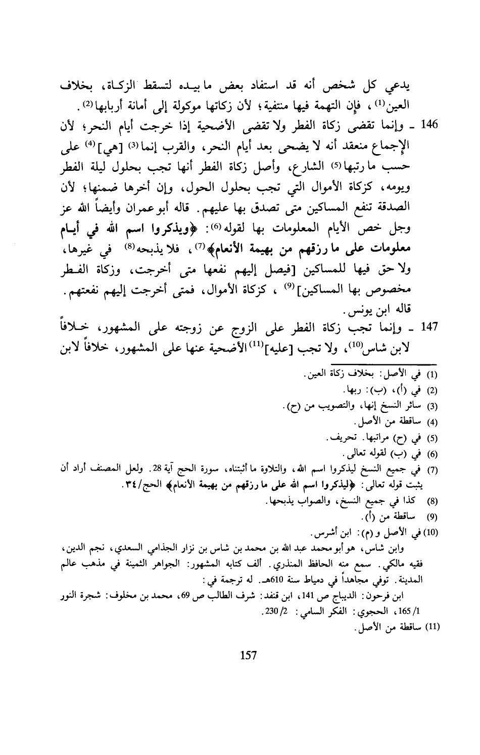147 - وإنما تجب زكاة الفطر على الزوج عن زوجته على المشهور، خلافًا لابن شاس (¬10)، ولا تجب [عليه] (¬11) الأضحية عنها على المشهور، خلافًا لابن
