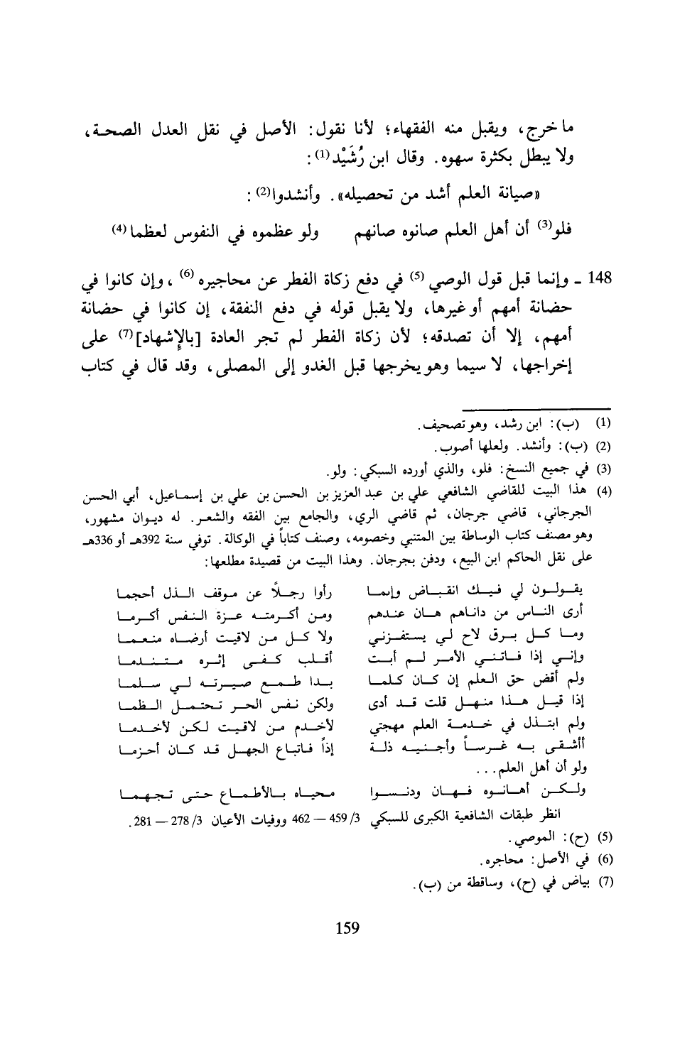 148 - وإنما قبل قول الوصي (¬5) في دفع زكاة الفطر عن محاجيره (¬6)، وإن كانوا في حضانة أمهم أو غيرها، ولا يقبل قوله في دفع النفقة، إن كانوا في حضانة أمهم، إلا أن تصدقه؛ لأن زكاة الفطر لم تجر العادة [بالإِشهاد] (¬7) على إخراجها، لا سيما وهو يخرجها قبل الغدو إلى المصلى، وقد قال في كتاب