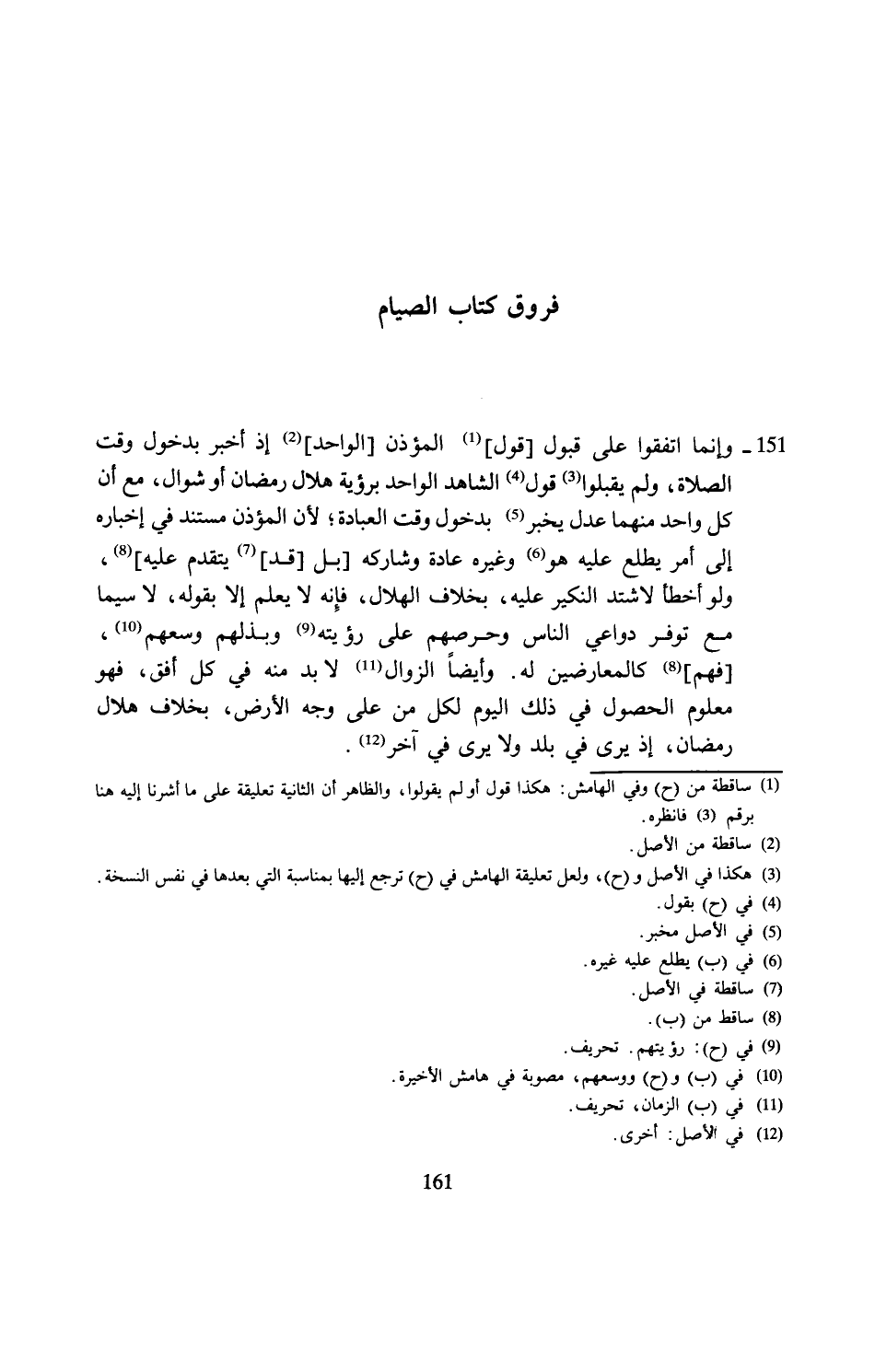 151 - وإنما اتفقوا على قبول [قول] (¬1) المؤذن [الواحد] (¬2) إذ أخبر بدخول وقت الصلاة، ولم يقبلوا (¬3) قول (¬4) الشاهد الواحد برؤية هلال رمضان أو شوال، مع أن كل واحد منهما عدل يخبر (¬5) بدخول وقت العبادة؛ لأن المؤذن مستند في إخباره إلى أمر يطلع عليه هو (¬6) وغيره عادة وشاركه [بل [قد] (¬7) يتقدم عليه] (¬8)، ولو أخطأ لاشتد النكير عليه، بخلاف الهلال، فإِنه لا يعلم إلا بقوله، لا سيما مع توفر دواعي الناس وحرصهم على رؤيته (¬9) وبذلهم وسعهم (¬10)، [فهم] (8) كالمعارضين له. وأيضًا الزوال (¬11) لا بد منه في كل أفق، فهو معلوم الحصول في ذلك اليوم لكل من على وجه الأرض، بخلاف هلال رمضان، إذ يرى في بلد ولا يرى في آخر (¬12).