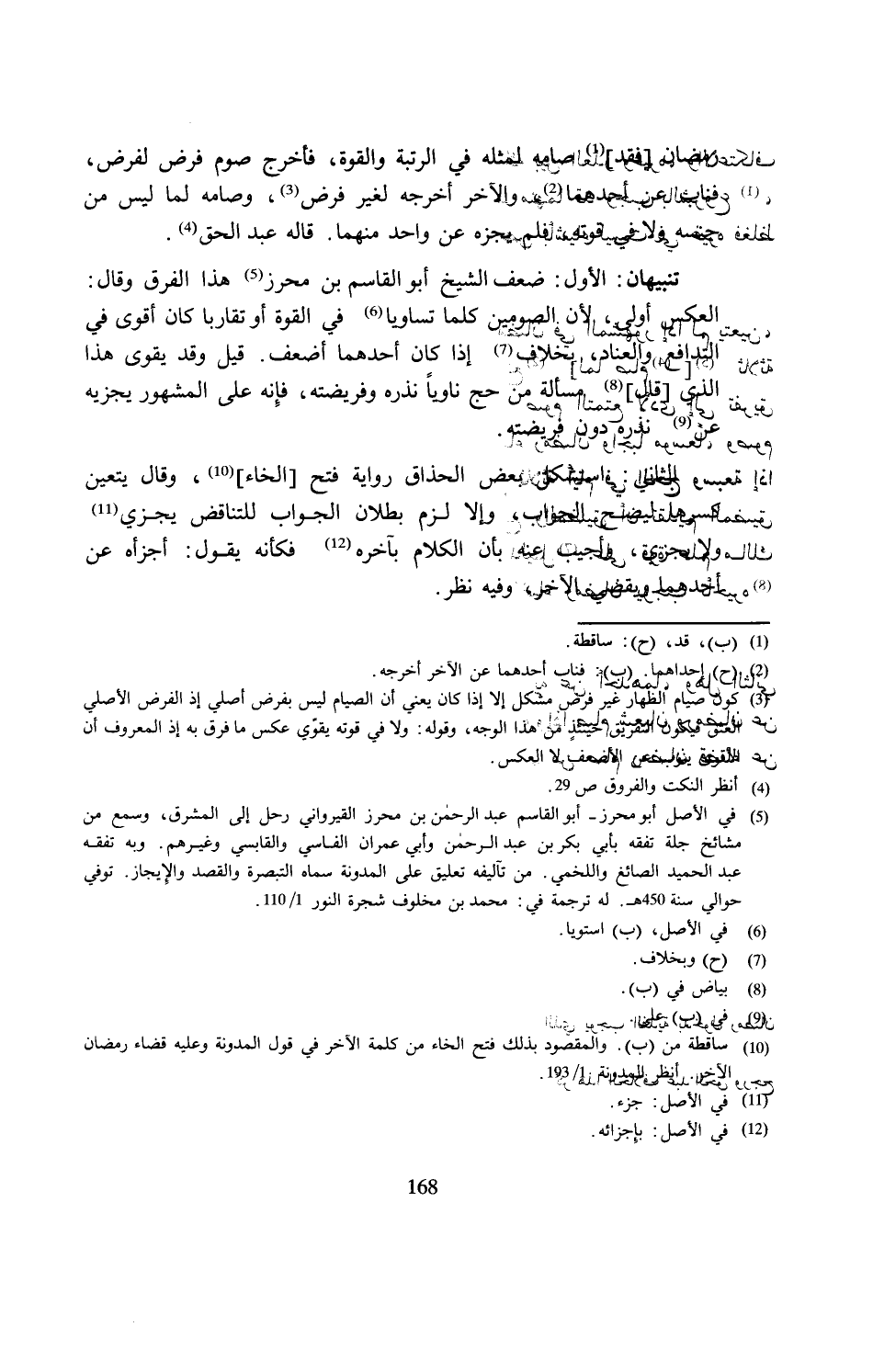 (¬5) في الأصل أبو محرز - أبو القاسم عبد الرحمن بن محرز القيرواني رحل إلى المشرق, وسمع منه مشائخ جلة تفقه بأبي بكر بن عبد الرحمن وأبي عمران الفاسي والقابسي وغيرهم. وبه تفقه عبد الحميد الصائغ واللخمي. من تآليفه تعليق على المدونة سماه التبصرة والقصد والإيجاز. توفى حوالي سنة 450 هـ. له ترجمة في: محمد بن مخلوف شجرة النور 1/ 110.