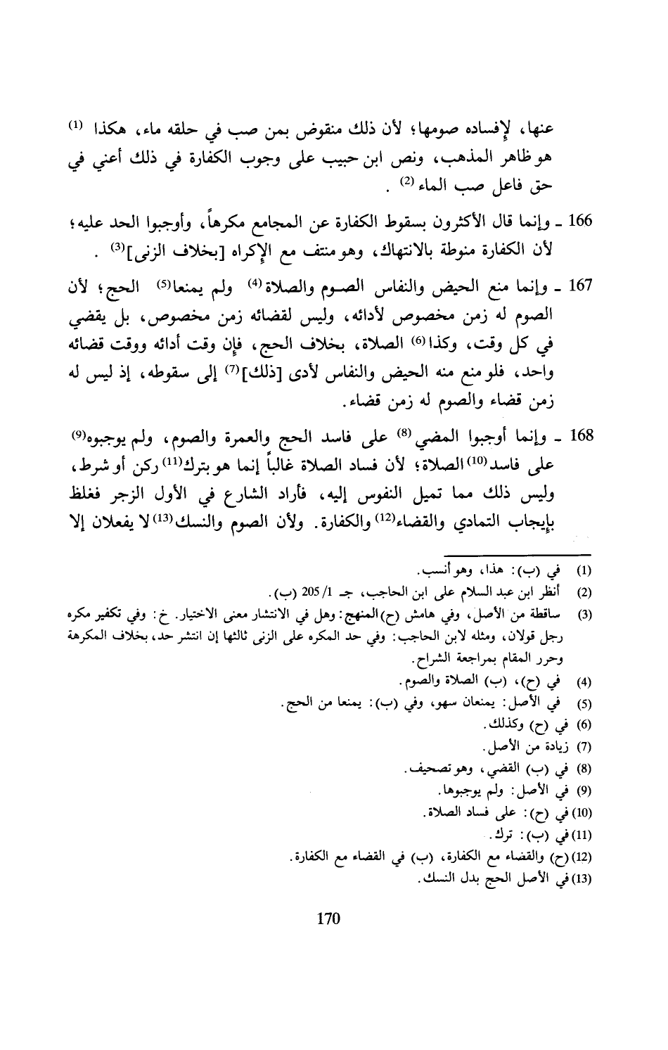 167 - وإنما منع الحيض والنفاس الصوم والصلاة (¬4) ولم يمنعا (¬5) الحج؛ لأن الصوم له زمن مخصوص لأدائه، وليس لقضائه زمن مخصوص، بل يقضي في كل وقت، وكذا (¬6) الصلاة، بخلاف الحج، فإِن وقت أدائه ووقت قضائه واحد، فلو منع منه الحيض والنفاس لأدى [ذلك] (¬7) إلى سقوطه، إذ ليس له زمن قضاء والصوم له زمن قضاء.