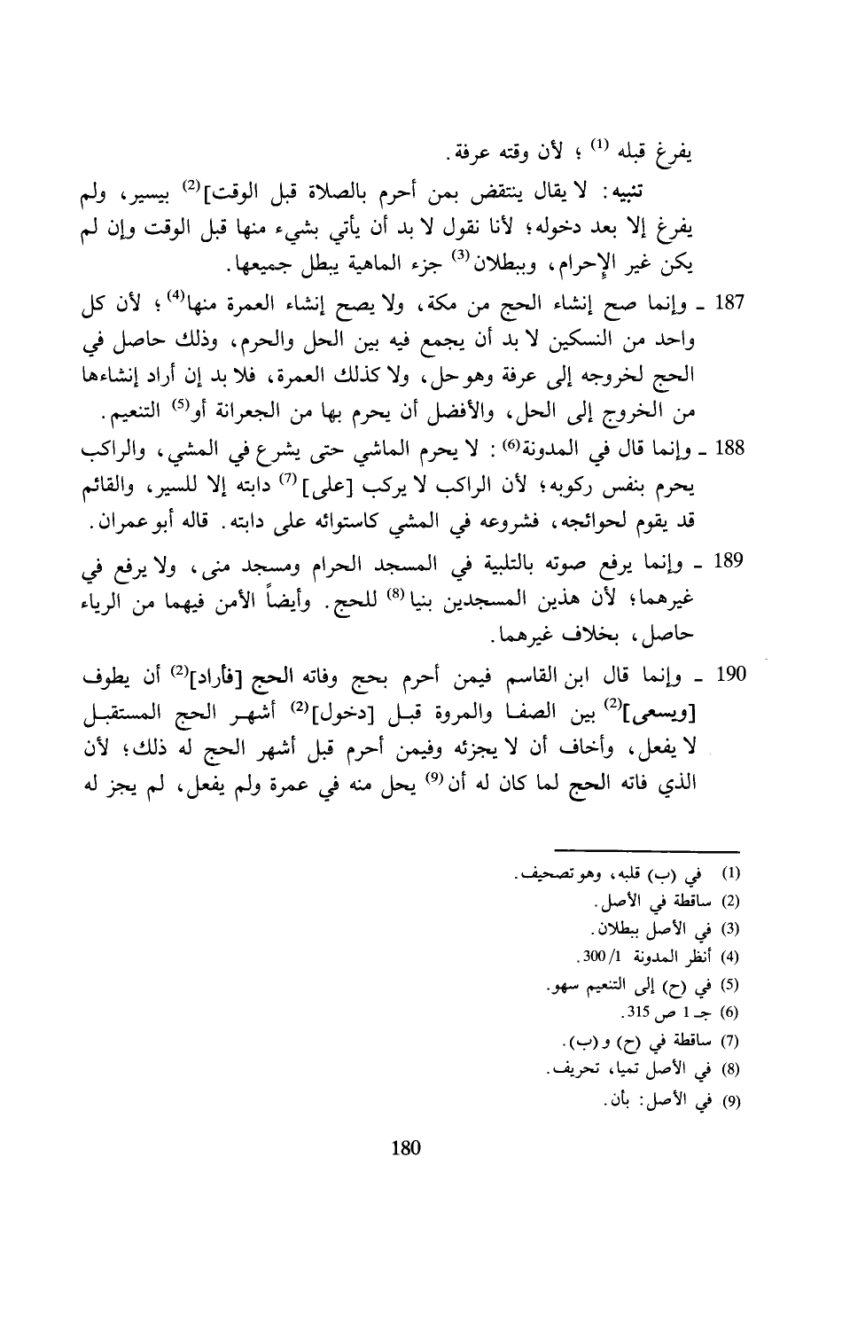 188 - وإنما قال في المدونة (¬6): لا يحرم الماشي حتى يشرع في المشي، والراكب يحرم بنفس ركوبه؛ لأن الراكب لا يركب [على] (¬7) دابته إلا للسير، والقائم قد يقوم لحوائجه، فشروعه في المشي كاستوائه على دابته. قاله أبو عمران.