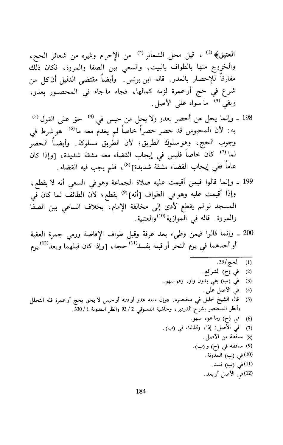 (¬5) قال الشيخ خليل في مختصره: "وإن منعه عدو أو فتنة أو حبس لا يحق بحج أو عمرة فله التحلل" انظر المختصر بشرح الدردير، وحاشية الدسوقي 2/ 93 وانظر المدونة 1/ 330.
