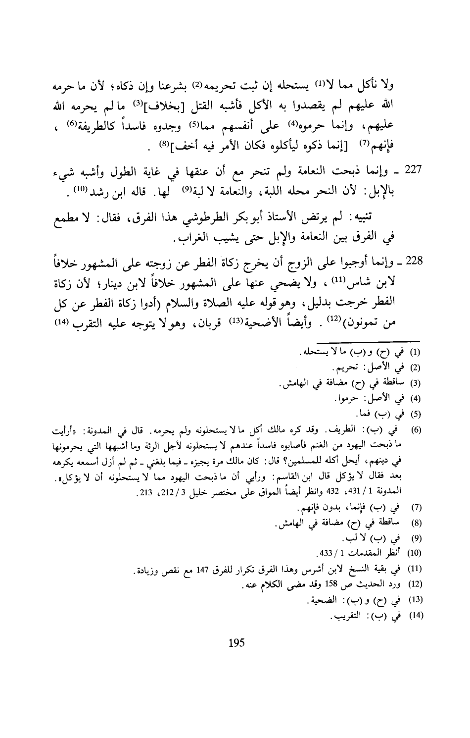227 - وإنما ذبحت النعامة ولم تنحر مع أن عنقها في غاية الطول وأشبه شيء بالإِبل: لأن النحر محله اللبة، والنعامة لا لبة (¬9) لها. قاله ابن رشد (¬10).