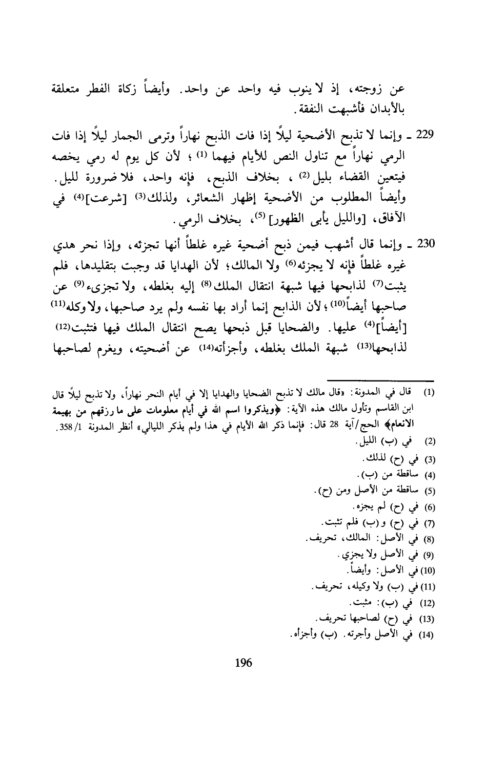229 - وإنما لا تذبح الأضحية ليلًا إذا فات الذبح نهارًا وترمى الجمار ليلًا إذا فات الرمي نهارًا مع تناول النص للأيام فيهما (¬1)؛ لأن كل يوم له رمي يخصه فيتعين القضاء بليل (¬2)، بخلاف الذبح، فإِنه واحد، فلا ضرورة لليل. وأيضًا المطلوب من الأضحية إظهار الشعائر، ولذلك (¬3) [شرعت] (¬4) في الآفاق، [والليل يأبى الظهور] (¬5)، بخلاف الرمي.