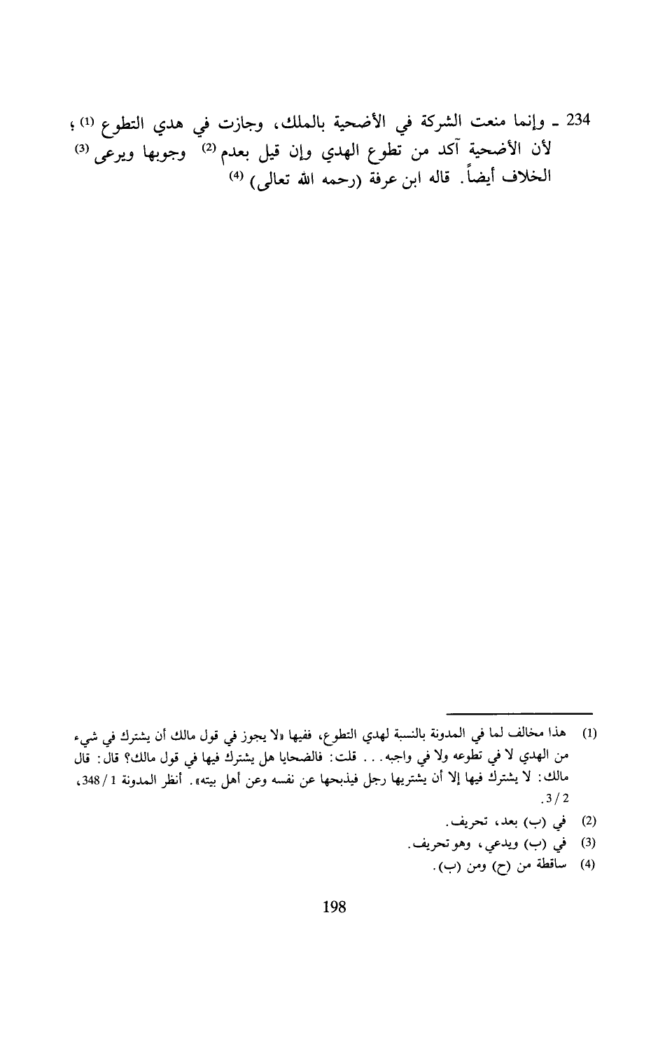 234 - وإنما منعت الشركة في الأضحية بالملك، وجازت في هدي التطوع (¬1)؛ لأن الأضحية آكد من تطوع الهدي وإن قيل بعدم (¬2) وجوبها ويرعى (¬3) الخلاف أيضًا. قاله ابن عرفة (رحمه الله تعالى) (¬4).
