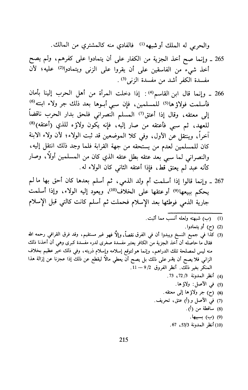 (¬3) كذا في جميع النسخ ويبدوا أن في الفرق نقصًا، وإلَّا فهو غير مستقيم، وقد فرق القرافي رحمه الله فقال ما حاصله أن أخذ الجزية من الكافر يعتبر مفسدة صغرى لدرء مفسدة كبرى وهي أن أخذنا ذلك منه ليس لمصلحة تلك الدراهم، وإنما هو لتوقع إسلامه وإسلام ذريته، وفي ذلك خير عظيم بخلاف الزاني فلا يصح أن يقر على ذلك بل يصح أن يعطي مالًا ليقطع عن ذلك إذا عجزنا عن إزالة هذا المنكر بغير ذلك. انظر الفروق 2/ 9 - 11.