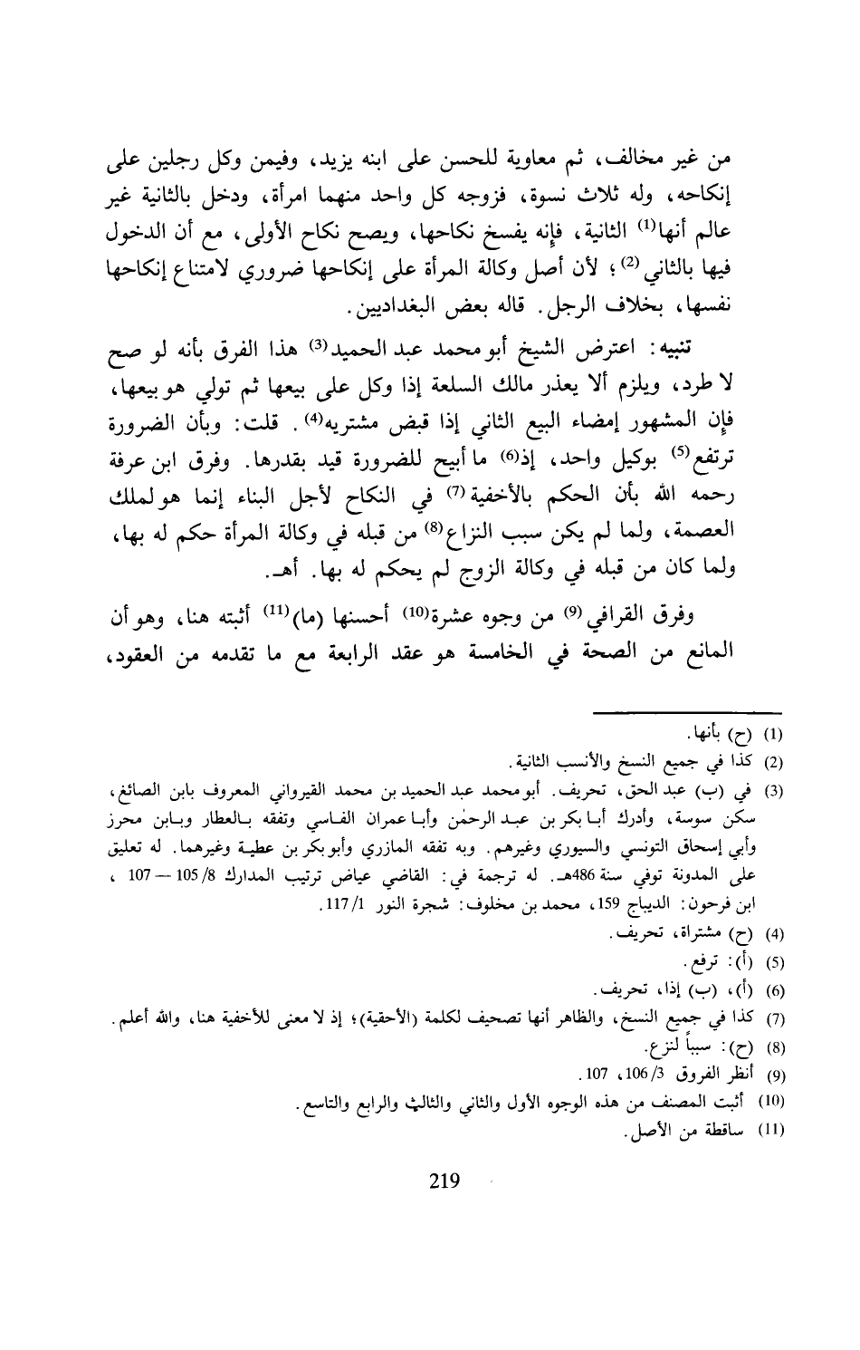 تنبيه: اعترض الشيخ أبو محمد عبد الحميد (¬3) هذا الفرق بأنه لو صح لا طرد، ويلزم ألا يعذر مالك السلعة إذا وكل على بيعها ثم تولي هو بيعها، فإِن المشهور إمضاء البيع الثاني إذا قبض مشتريه (¬4). قلت: وبأن الضرورة ترتفع (¬5) بوكيل واحد، إذ (¬6) ما أبيح للضرورة قيد بقدرها. وفرق ابن عرفة رحمه الله بأن الحكم بالأخفية (¬7) في النِّكَاح لأجل البناء إنما هو لملك العصمة، ولما لم يكن سبب النزاع (¬8) من قبله في وكالة المرأة حكم له بها، ولما كان من قبله في وكالة الزوج لم يحكم له بها. أهـ.