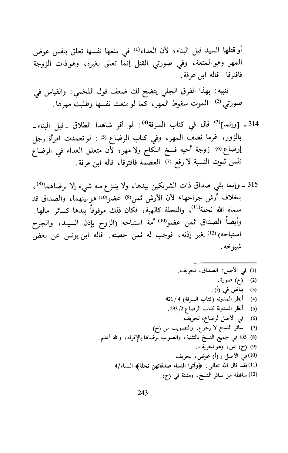 314 - [وإنما] (¬3) قال في كتاب السرقة (¬4): لو أقر شاهدا الطلاق -قبل البناء- بالزور، غرما نصف المهر، وفي كتاب الرضاع (¬5): لو تعمدت امرأة رجل إرضاع (¬6) زوجة أخيه فسخ النِّكَاح ولا مهر؛ لأن متعلق العداء في الرضاع نفس ثبوت النسبة لا رفع (¬7) العصمة فافترقا، قاله ابن عرفة.