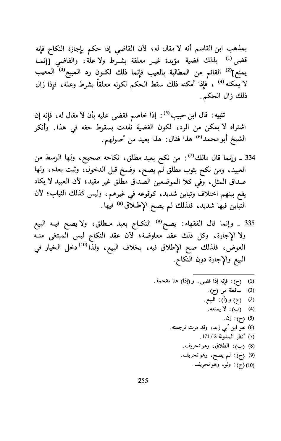 334 - وإنما قال مالك (¬7): من نكح بعبد مطلق، نكاحه صحيح، ولها الوسط من العبيد، ومن نكح بثوب مطلق لم يصح، وفسخ قبل الدخول، وثبت بعده، ولها صداق المثل، وفي كلا الموضعين الصداق مطلق غير مقيد؛ لأن العبيد لا يكاد يقع بينهم اختلاف وتباين شديد، كوقوعه في غيرهم، وليس كذلك الثياب؛ لأن التباين فيها شديد، فلذلك لم يصح الإطلاق (¬8) فيها.
