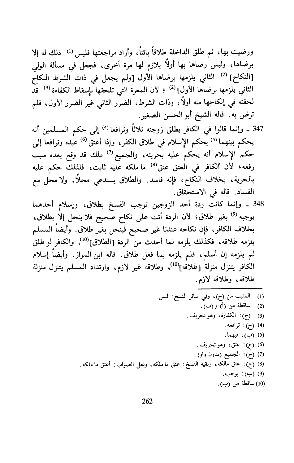 347 - وإنما قالوا في الكافر يطلق زوجته ثلاثًا وترافعا (¬4) إلى حكم المسلمين أنه يحكم بينهما (¬5) بحكم الإِسلام في طلاق الكفر، وإذا أعتق (¬6) عبده وترافعا إلى حكم الإِسلام أنه يحكم عليه بحريته، والجميع (¬7) ملك قد وقع بعده سبب رفعه؛ لأن الكافر في العتق عتق (¬8) ماملكه عليه ثابت، فلذلك حكم عليه بالحرية، بخلاف النكاح، فإِنه فاسد. والطلاق يستدعي محلًا، ولا محل مع الفساد. قاله في الاستحقاق.