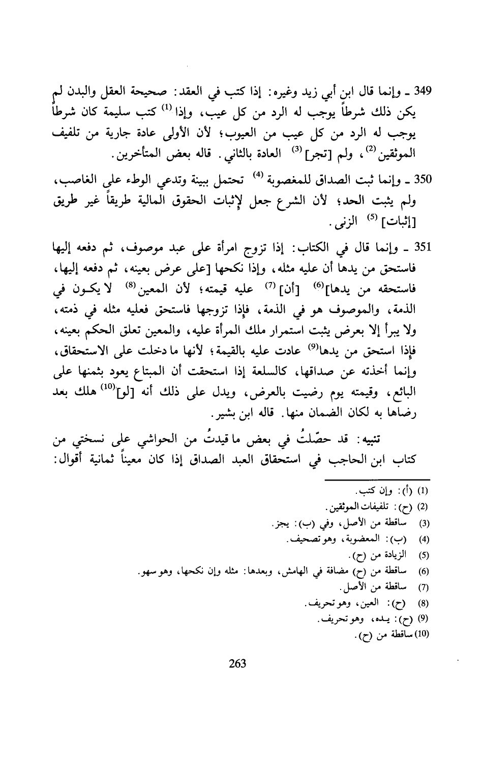 349 - وإنما قال ابن أبي زيد وغيره: إذا كتب في العقد: صحيحة العقل والبدن لم يكن ذلك شرطًا يوجب له الرد من كل عيب، وإذا (¬1) كتب سليمة كان شرطا يوجب له الرد من كل عيب من العيوب؛ لأن الأولى عادة جارية من تلفيف الموثقين (¬2)، ولم [تجر] (¬3) العادة بالثاني. قاله بعض المتأخرين.
