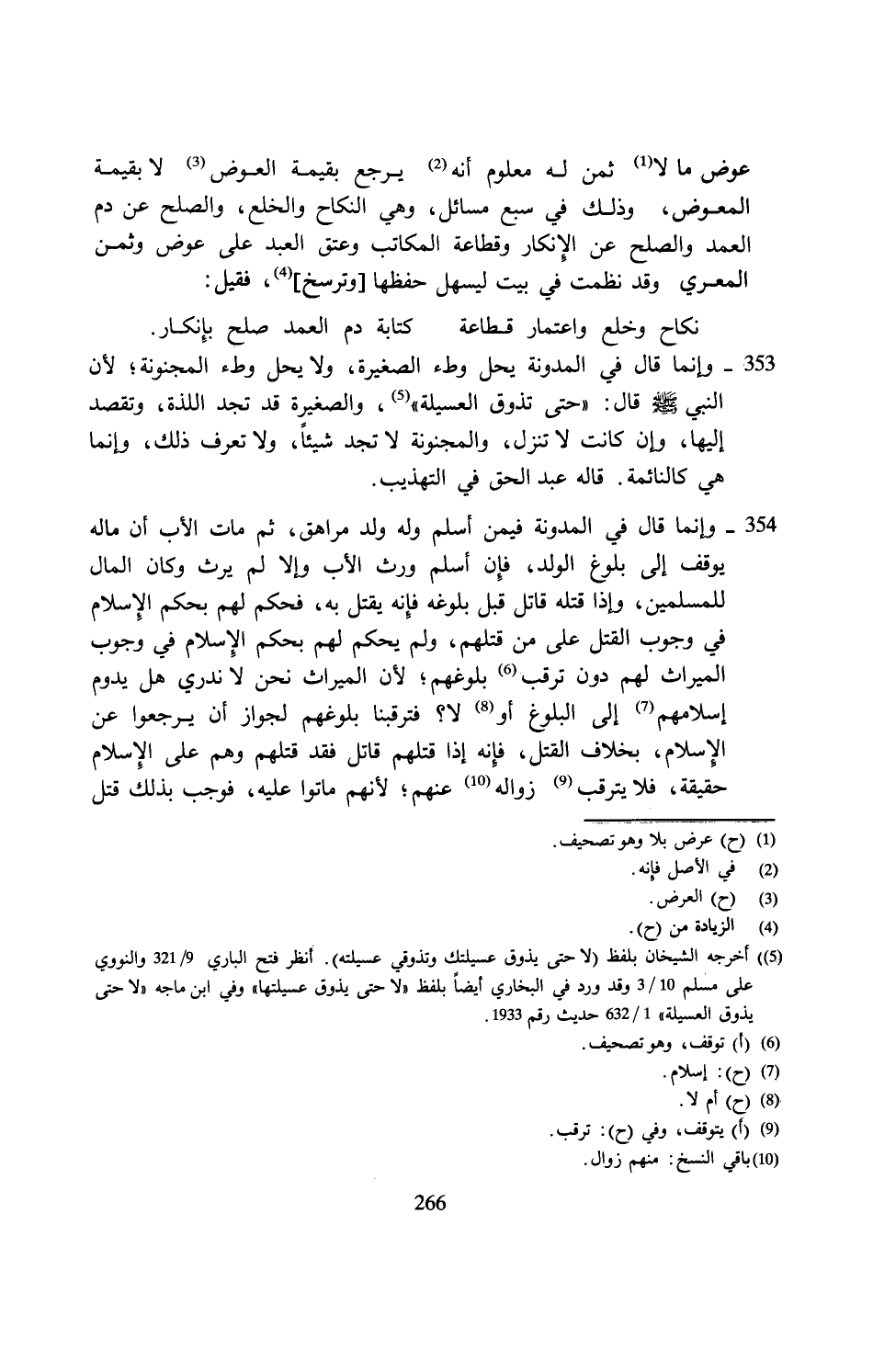 (¬5) أخرجه الشيخان بلفظ (لا حتى يذوق عسيلتك وتذوقي عسيلته). انظر فتح الباري 9/ 321 والنووي على مسلم 10/ 3 وقد ورد في البخاري أيضًا بلفظ "لا حتى يذوق عسيلتها" وفي ابن ماجه "لا حتى يذوق العسيلة" 1/ 632 حديث رقم 1933.