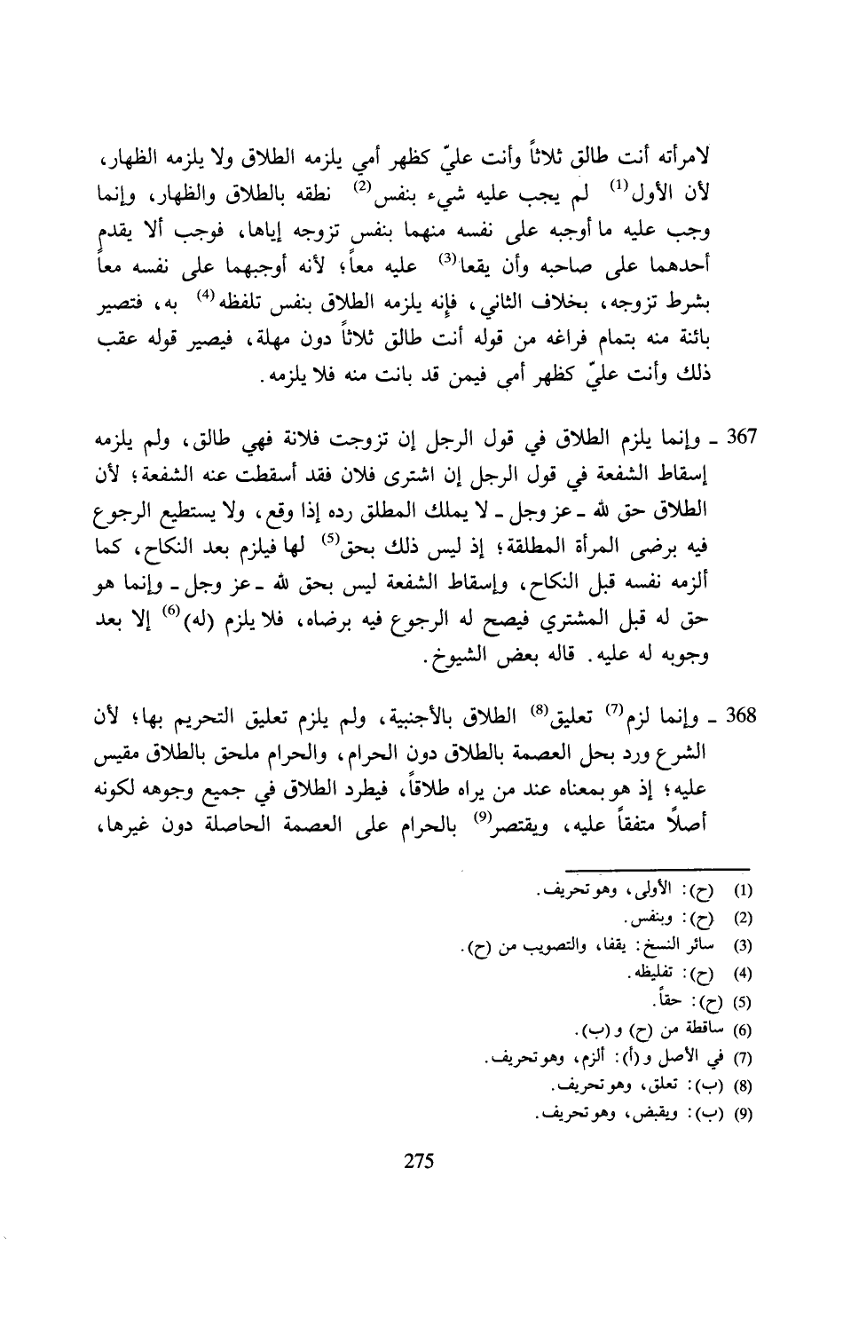 367 - وإنما يلزم الطلاق في قول الرجل إن تزوجت فلانة فهي طالق، ولم يلزمه إسقاط الشفعة في قول الرجل إن اشترى فلان فقد أسقطت عنه الشفعة؛ لأن الطلاق حق لله -عَزَّ وَجَلَّ- لا يملك المطلق رده إذا وقع، ولا يستطيع الرجوع فيه برضى المرأة المطلقة؛ إذ ليس ذلك بحق (¬5) لها فيلزم بعد النكاح، كما ألزمه نفسه قبل النكاح، وإسقاط الشفعة ليس بحق لله -عَزَّ وَجَلَّ- وإنما هو حق له قبل المشتري فيصح له الرجوع فيه برضاه، فلا يلزم (له) (¬6) إلا بعد وجوبه له عليه. قاله بعض الشيوخ.