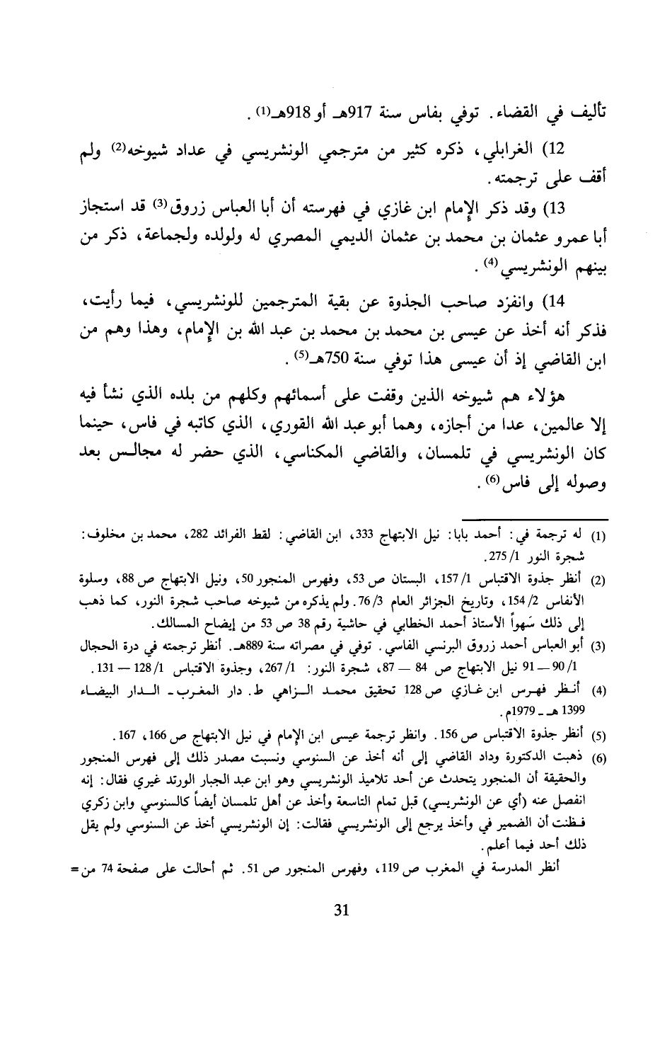 14) وانفرد صاحب الجذوة عن بقية المترجمين للونشريسي، فيما رأيت، فذكر أنه أخذ عن عيسى بن محمد بن محمد بن عبد الله بن الإِمام، وهذا وهم من ابن القاضي إذ أن عيسى هذا توفي سنة 750 هـ (¬5).