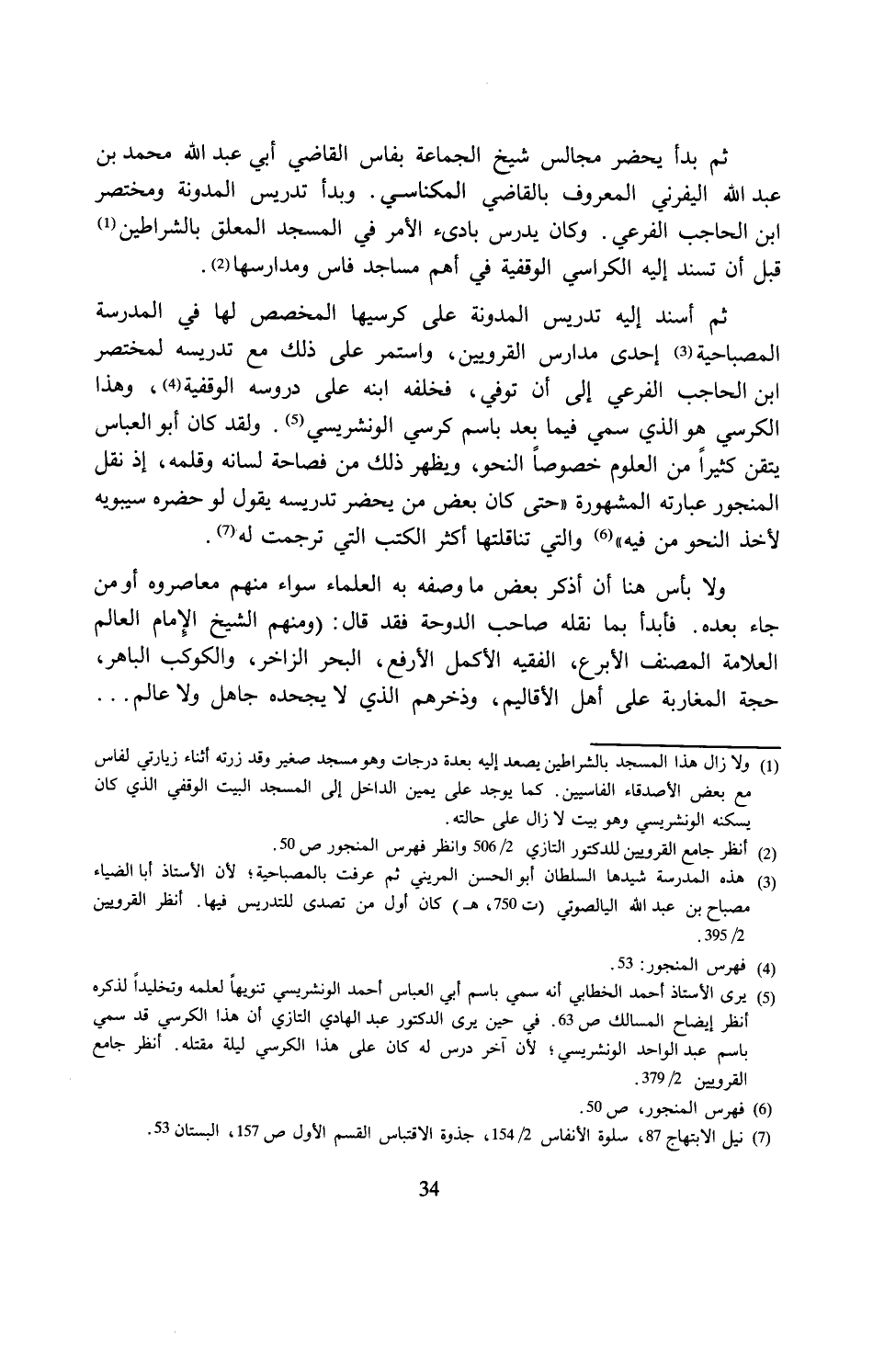 (¬5) يرى الأستاذ أحمد الخطابي أنه سمي باسم أبي العباس أحمد الونشريسي تنويهًا لعلمه وتخليدًا لذكره انظر إيضاح المسالك ص 63. في حين يرى الدكتور عبد الهادي التازي أن هذا الكرسي قد سمي باسم عبد الواحد الونشريسي؛ لأن آخر درس له كان على هذا الكرسي ليلة مقتله. انظر جامع القرويين 2/ 379.