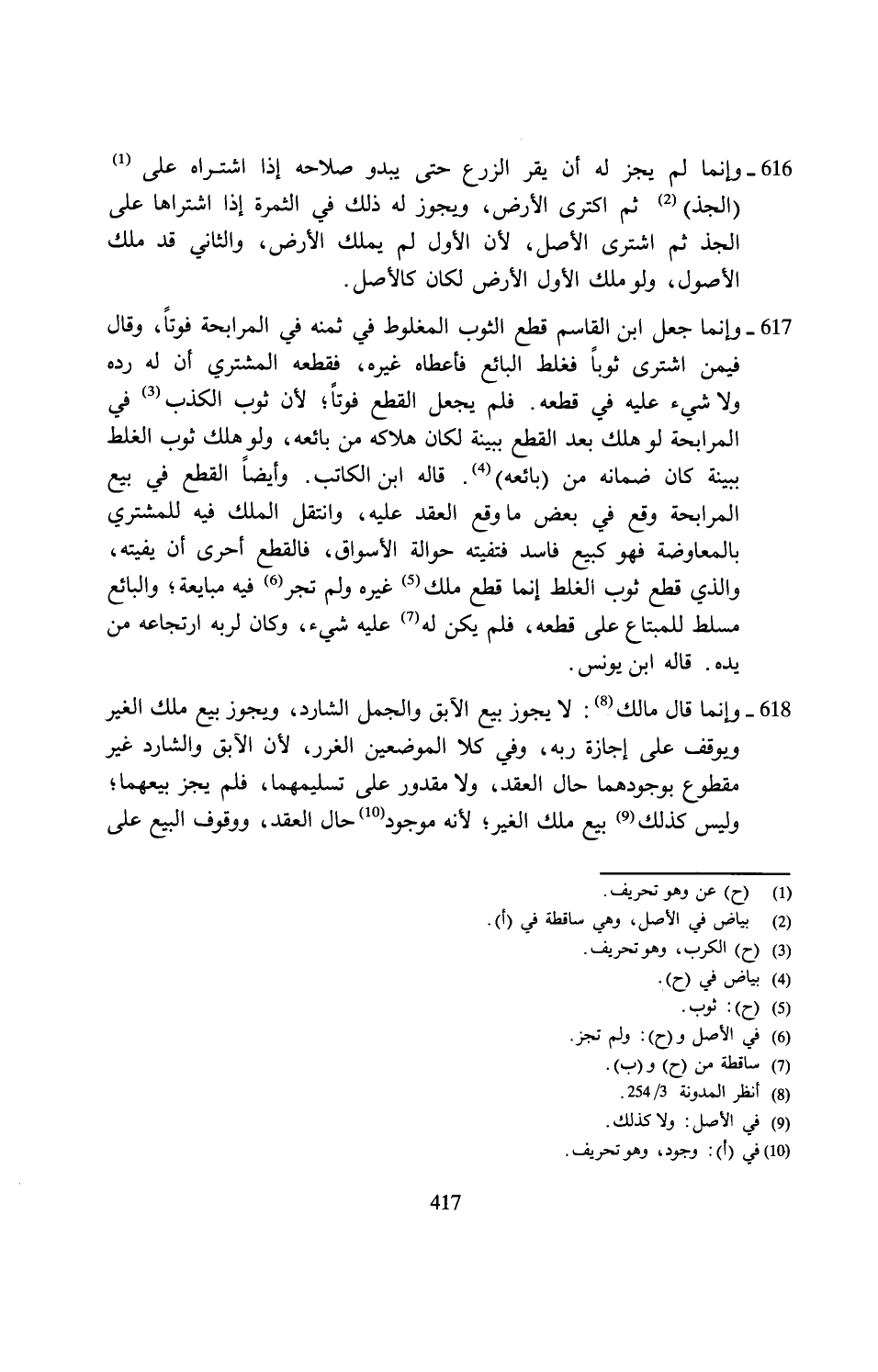 617 - وإنما جعل ابن القاسم قطع الثوب المغلوط في ثمنه في المرابحة فوتًا، وقال فيمن اشترى ثوبًا فغلط البائع فأعطاه غيره، فقطعه المشتري أن له رده ولا شيء عليه في قطعه. فلم يجعل القطع فوتًا؛ لأن ثوب الكذب (¬3) في المرابحة لو هلك بعد القطع ببينة لكان هلاكه من بائعه، ولو هلك ثوب الغلط ببينة كان ضمانه من (بائعه) (¬4). قاله ابن الكاتب. وأيضًا القطع في بيع المرابحة وقع في بعض ماوقع العقد عليه، وانتقل الملك فيه للمشتري بالمعاوضة فهو كبيع فاسد فتفيته حوالة الأسواق، فالقطع أحرى أن يفيته، والذي قطع ثوب الغلط إنما قطع ملك (¬5) غيره ولم تجر (¬6) فيه مبايعة؛ والبائع مسلط للمبتاع على قطعه، فلم يكن له (¬7) عليه شيء، وكان لربه ارتجاعه من يده. قاله ابن يونس.