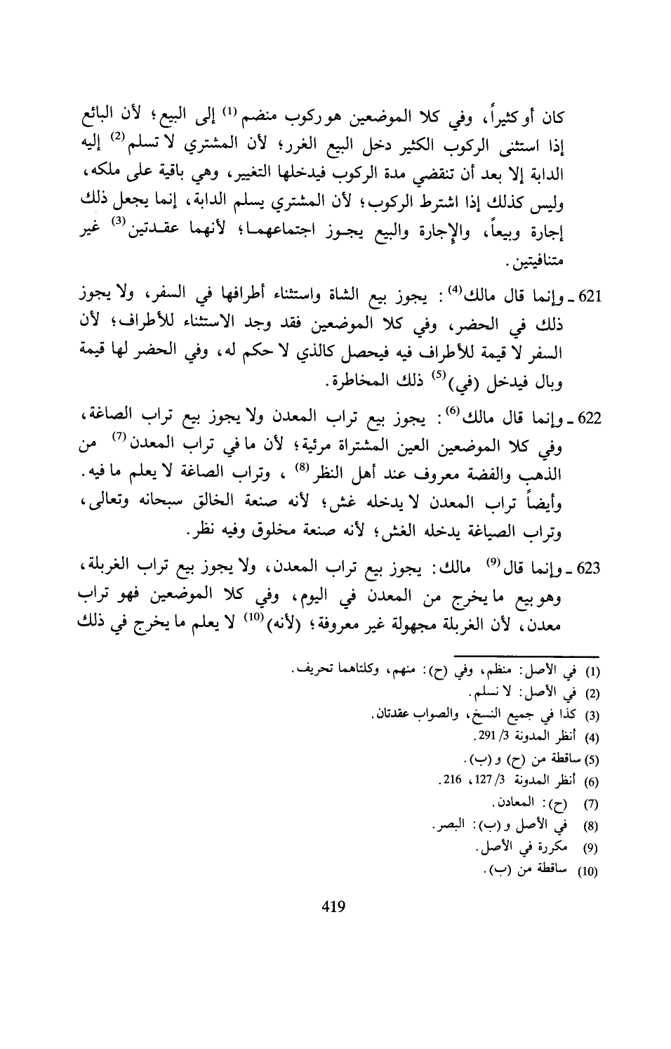 622 - وإنما قال مالك (¬6): يجوز بيع تراب المعدن ولا يجوز بيع تراب الصاغة، وفي كلا الموضعين العين المشتراة مرئية؛ لأن ما في تراب المعدن (¬7) من الذهب والفضة معروف عند أهل النظر (¬8)، وتراب الصاغة لا يعلم ما فيه. وأيضًا تراب المعدن لا يدخله غش؛ لأنه صنعة الخالق سبحانه وتعالى، وتراب الصياغة يدخله الغش؛ لأنه صنعة مخلوق وفيه نظر.