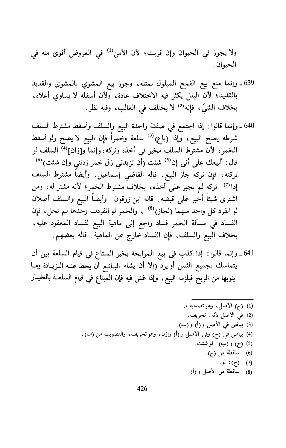 639 - وإنما منع بيع القمح المبلول بمثله، وجوز بيع المشوي بالمشوى والقديد بالقديد؛ لأن البلل يكثر فيه الاختلاف عادة، ولأن أسفله لا يساوي أعلاه، بخلاف الشيّ، فإِنه (¬2) لا يختلف في الغالب، وفيه نظر.