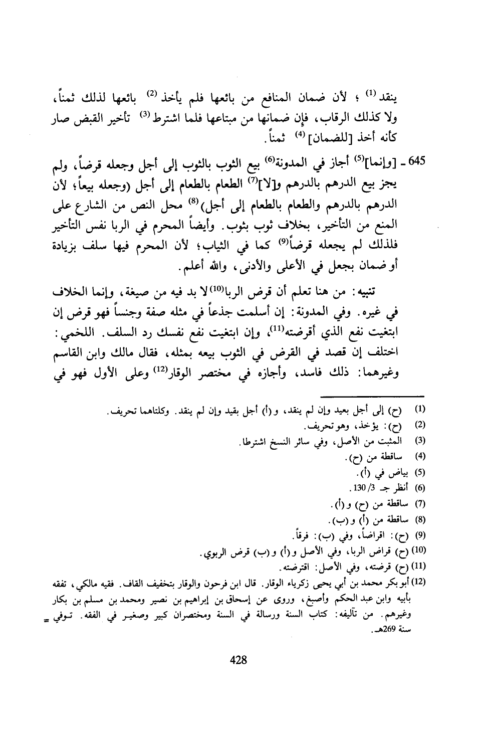 645 - [وإنما] (¬5) أجاز في المدونة (¬6) بيع الثوب بالثوب إلى أجل وجعله قرضًا، ولم يجز بيع الدرهم بالدرهم و [لا] (¬7) الطعام بالطعام إلى أجل (وجعله بيعًا؛ لأن الدرهم بالدرهم والطعام بالطعام إلى أجل) (¬8) محل النص من الشارع على المنع من التأخير، بخلاف ثوب بثوب. وأيضًا المحرم في الربا نفس التأخير فلذلك لم يجعله قرضًا (¬9) كما في الثياب؛ لأن المحرم فيها سلف بزيادة أو ضمان بجعل في الأعلى والأدنى، والله أعلم.