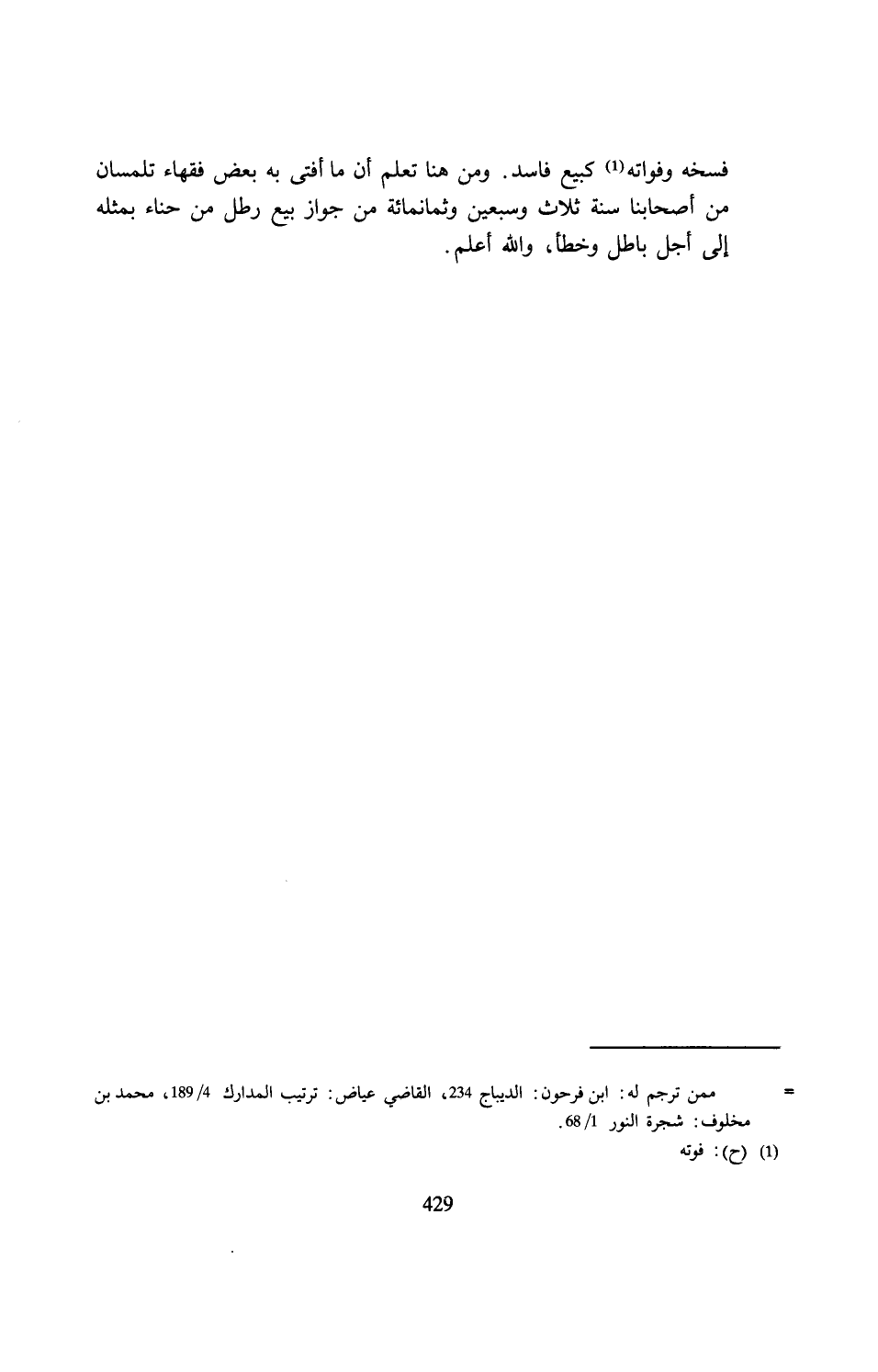 فسخه وفواته (¬1) كبيع فاسد. ومن هنا تعلم أن ما أفتى به بعض فقهاء تلمسان من أصحابنا سنة ثلاث وسبعين وثمانمائة من جواز بيع رطل من حناء بمثله إلى أجل باطل وخطأ، والله أعلم.