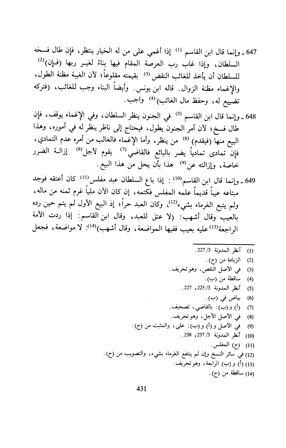 648 - وإنما قال ابن القاسم (¬5) في الجنون ينظر السلطان، وفي الإِغماء يوقف، فإِن طال فسخ؛ لأن أمر الجنون يطول، فيحتاج إلى ناظر ينظر له في أموره، وهذا البيع منها (فيقدم) (¬6) من ينظر، وأما الإِغماء فالغالب من أمره عدم التمادي، فإِن تمادى تماديًا يضر بالبائع فالقاضي (¬7) يقوم لأجل (¬8) إزالة الضرر خاصة، وإزالته عن (¬9) هذا بأن يحل من هذا البيع.