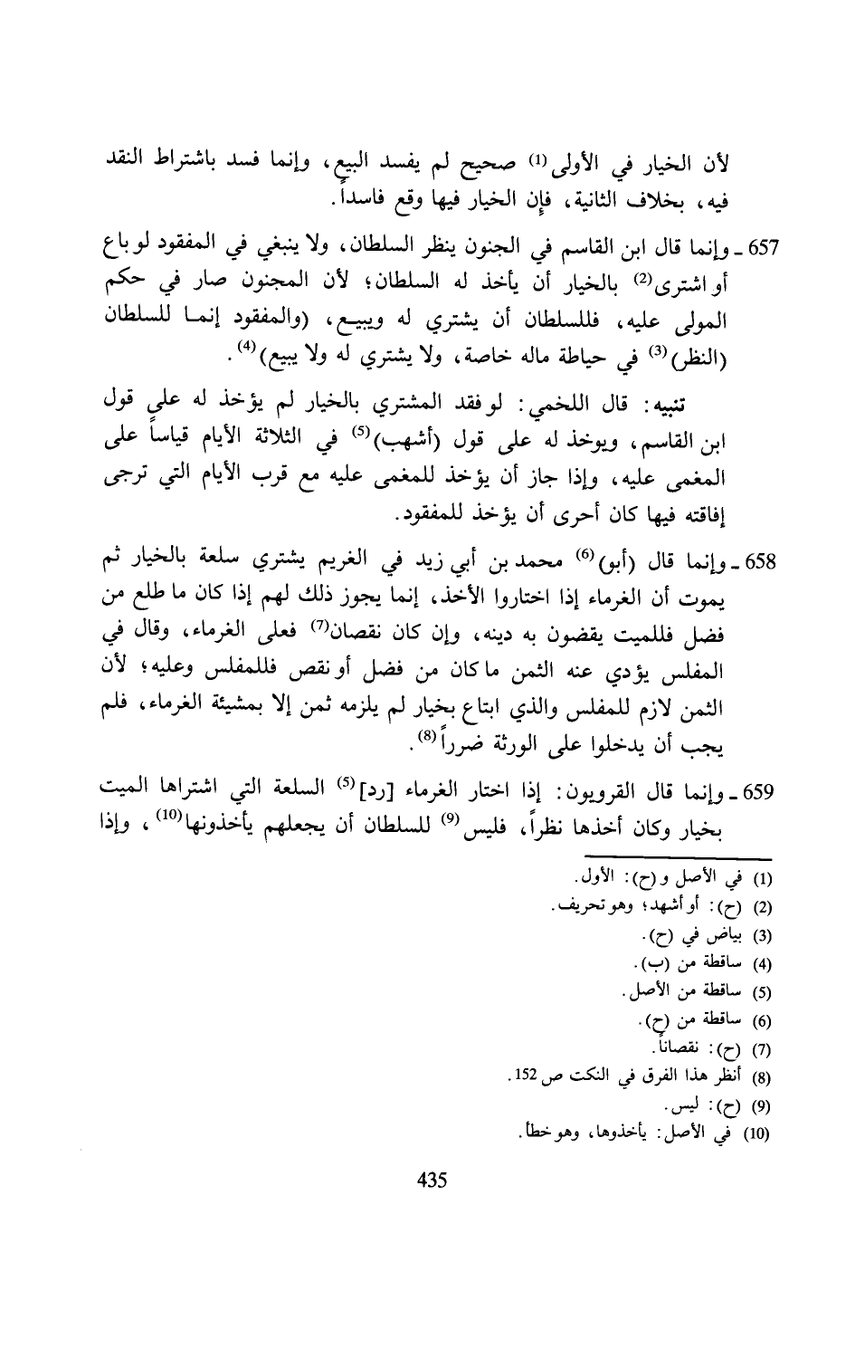 657 - وإنما قال ابن القاسم في الجنون ينظر السلطان، ولا ينبغي في المفقود لو باع أو اشترى (¬2) بالخيار أن يأخذ له السلطان، لأن المجنون صار في حكم المولى عليه، فللسلطان أن يشتري له ويبيع، (والمفقود إنما للسلطان (النظر) (¬3) في حياطة ماله خاصة، ولا يشتري له ولا يبيع) (¬4).