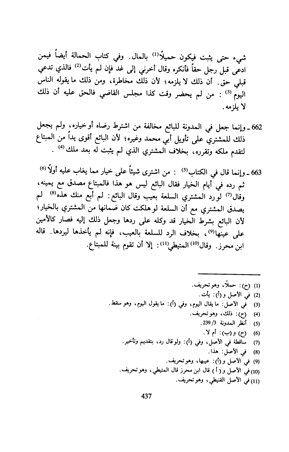 شيء حتى يثبت فيكون حميلًا (¬1) بالمال. وفي كتاب الحمالة أيضًا فيمن ادعى قبل رجل حقًّا فأنكره وقال أخرني إلى غد فإن لم يأت (¬2) فالذي تدعي قبلي حق. أن ذلك لا يلزمه؛ لأن ذلك مخاطرة، ومن ذلك ما يقوله الناس اليوم (¬3): من لم يحضر وقت كذا مجلس القاضي فالحق عليه أن ذلك لا يلزمه.