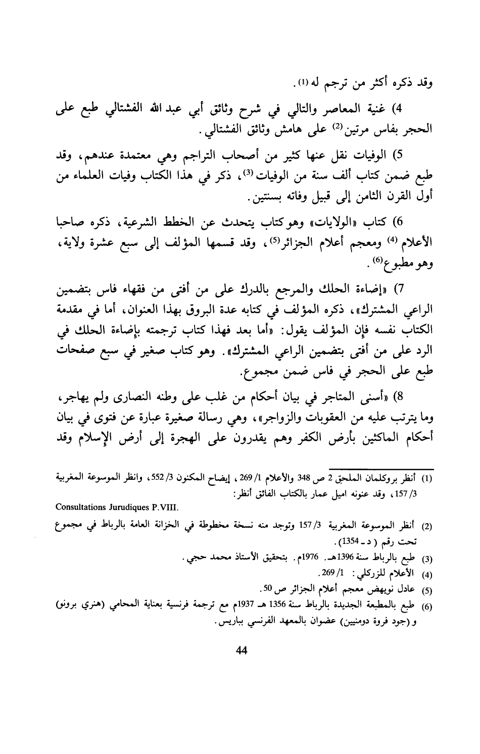 (¬2) انظر الموسوعة المغربية 3/ 157 وتوجد منه نسخة مخطوطة في الخزانة العامة بالرباط في مجموع تحت رقم (د- 1354).