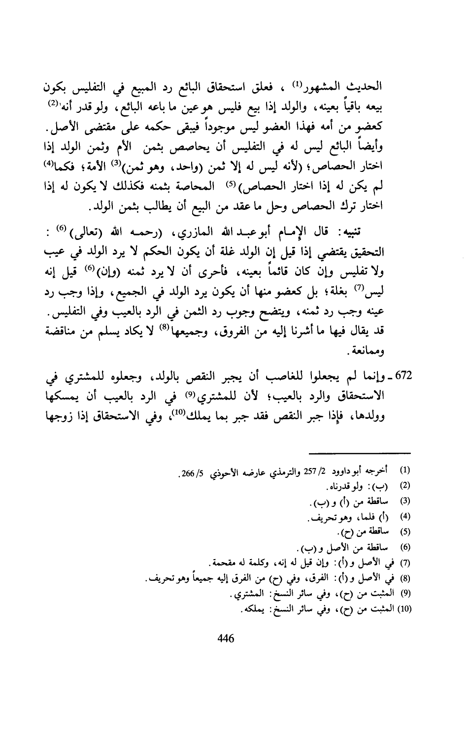 تنبيه: قال الإمام أبو عبد الله المازري، (رحمه الله (تعالى) (6): التحقيق يقتضي إذا قيل إن الولد غلة أن يكون الحكم لا يرد الولد في عيب ولا تفليس وإن كان قائمًا بعينه، فأحرى أن لا يرد ثمنه (وإن) (¬6) قيل إنه ليس (¬7) بغلة؛ بل كعضو منها أن يكون يرد الولد في الجميع، وإذا وجب رد عينه وجب رد ثمنه، ويتضح وجوب رد الثمن في الرد بالعيب وفي التفليس. قد يقال فيها ما أشرنا إليه من الفروق، وجميعها (¬8) لا يكاد يسلم من مناقضة وممانعة.