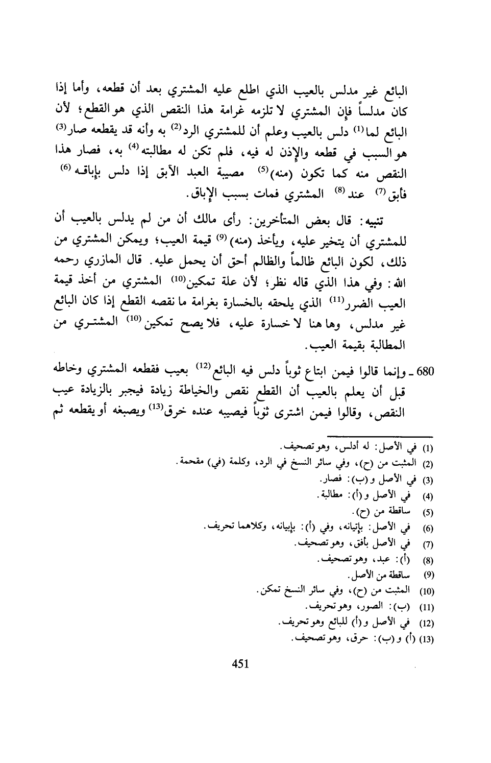 680 - وإنما قالوا فيمن ابتاع ثوبًا دلس فيه البائع (¬12) بعيب فقطعه المشتري وخاطه قبل أن يعلم بالعيب أن القطع نقص والخياطة زيادة فيجبر بالزيادة عيب النقص، وقالوا فيمن اشترى ثوبًا فيصيبه عنده خرق (¬13) ويصبغه أو يقطعه ثم