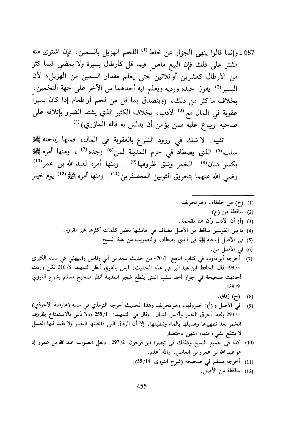 (¬7) أخرجه أبو داوود في كتاب الحج 1/ 470 من حديث سعد بن أبي وقاص والبيهقي في سننه الكبرى 5/ 199 قال الحافظ ابن عبد البر في هذا الحديث: ليس بالقوي انظر التمهيد 6/ 310 لكن وردت أحاديث صحيحة في جواز أخذ سلب الذي يقطع شجر المدينة انظر صحيح مسلم بشرح النووي 9/ 138.
