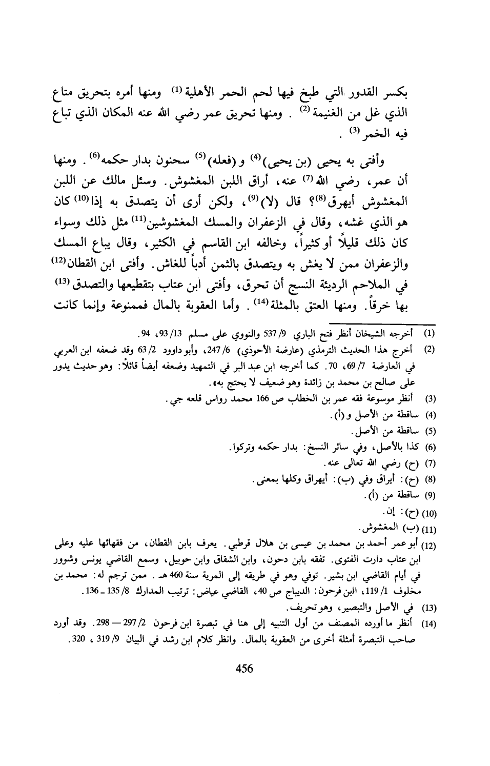وأفتى به يحيى (بن يحيى) (¬4) و (فعله) (¬5) سحنون بدار حكمه (¬6). ومنها أن عمر، رضي الله (¬7) عنه، أراق اللبن المغشوش. وسئل مالك عن اللبن المغشوش أيهرق (¬8)؟ قال (لا) (¬9)، ولكن أرى أن يتصدق به إذا (¬10) كان هو الذي غشه، وقال في الزعفران والمسك المغشوشين (¬11) مثل ذلك وسواء كان ذلك قليلًا أو كثيرًا، وخالفه ابن القاسم في الكثير، وقال يباع المسك والزعفران ممن لا يغش به ويتصدق بالثمن أدبًا للغاش. وأفتى ابن القطان (¬12) في الملاحم الرديئة النسج أن تحرق، وأفتى ابن عتاب بتقطيعها والتصدق (¬13) بها خرقًا. ومنها العتق بالمثلة (¬14). وأما العقوبة بالمال فممنوعة وإنما كانت