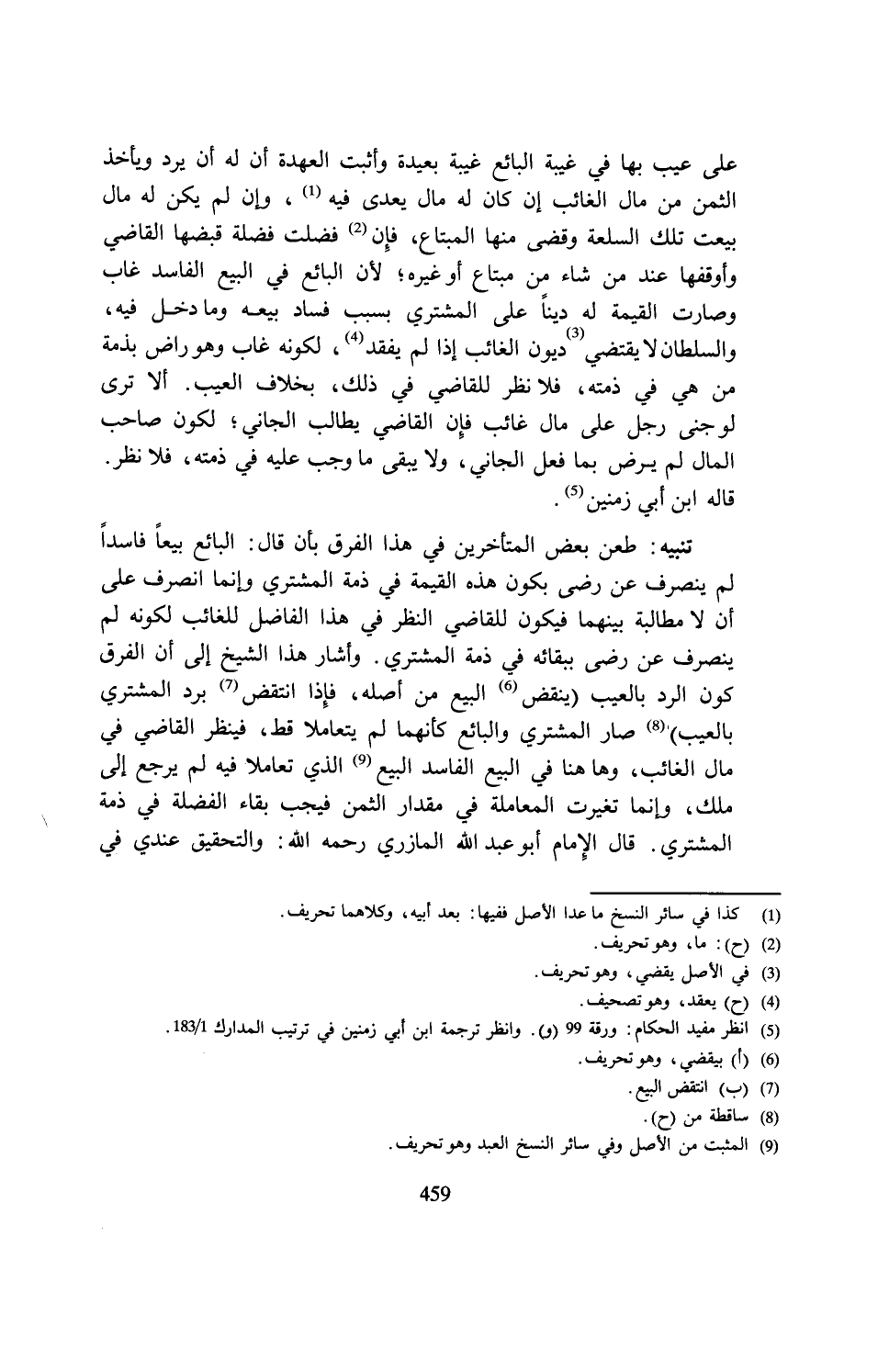 تنبيه: طعن بعض المتأخرين في هذا الفرق بأن قال: البائع بيعًا فاسدًا لم ينصرف عن رضي بكون هذه القيمة في ذمة المشتري وإنما انصرف على أن لا مطالبة بينهما فيكون للقاضي النظر في هذا الفاضل للغائب لكونه لم ينصرف عن رضي ببقائه في ذمة المشتري. وأشار هذا الشيخ إلى أن الفرق كون الرد بالعيب (ينقض (¬6) البيع من أصله، فإِذا انتقض (¬7) برد المشتري بالعيب (¬8) صار المشتري والبائع كأنهما لم يتعاملا قط، فينظر القاضي في مال الغائب، وها هنا في البيع الفاسد البيع (¬9) الذي تعاملا فيه لم يرجع إلى ملك، وإنما تغيرت المعاملة في مقدار الثمن فيجب بقاء الفضلة في ذمة المشتري. قال الإِمام أبو عبد الله المازري رحمه الله: والتحقيق عندي في