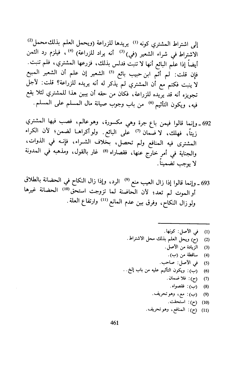 إلى اشتراط المشتري كونه (¬1) يريدها للزراعة (ويحمل العلم بذلك محمل (¬2) الاشتراط في شراء الشعير (في) (¬3) أنه يراد للزراعة) (¬4)، فيلزم رد الثمن أيضًا إذا علم البائع أنها لا تنبت فدلس بذلك، فزرعها المشتري، فلم تنبت. فإِن قلت: لم أثم ابن حبيب بائع (¬5) الشعير إن علم أن الشعير المبيع لا ينبت فكتم مع أن المشتري لم يذكر له أنه يريده للزراعة؟ قلت: لأجل تجويزه أنه قد يريده للزراعة، فكان من حقه أن يبين هذا للمشتري لئلا يقع فيه، ويكون التأثيم (¬6) من باب وجوب صيانة مال المسلم على المسلم.