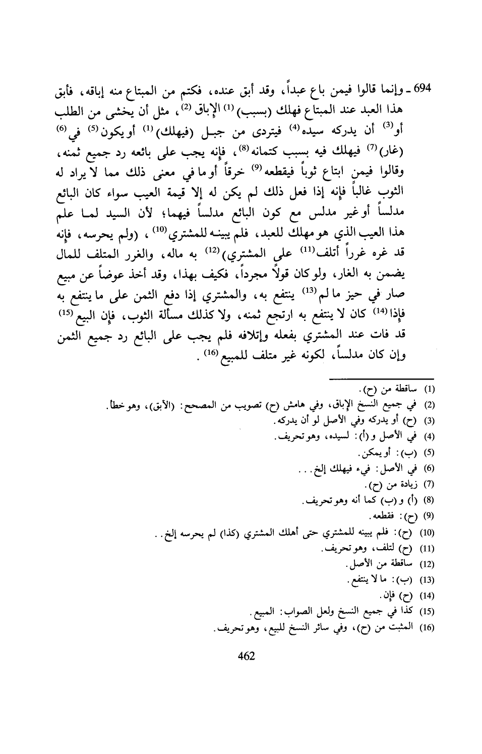 694 - وإنما قالوا فيمن باع عبدًا، وقد أبق عنده، فكتم من المبتاع منه إباقه، فأبق هذا العبد عند المبتاع فهلك (بسبب) (¬1) الإِباق (¬2)، مثل أن يخشى من الطلب أو (¬3) أن يدركه سيده (¬4) فيتردى من جبل (فيهلك) (1) أو يكون (¬5) في (¬6) (غار) (¬7) فيهلك فيه بسبب كتمانه (¬8)، فإِنه يجب على بائعه رد جميع ثمنه، وقالوا فيمن ابتاع ثوبًا فيقطعه (¬9) خرقًا أو ما في معنى ذلك مما لا يراد له الثوب غالبًا فإِنه إِذا فعل ذلك لم يكن له إلا قيمة العيب سواء كان البائع مدلسًا أو غير مدلس مع كون البائع مدلسًا فيهما؛ لأن السيد لما علم هذا العيب الذي هو مهلك للعبد، فلم يبينه للمشتري (¬10)، (ولم يحرسه، فإِنه قد غره غررًا أتلف (¬11) على المشتري) (¬12) به ماله، والغرر المتلف للمال يضمن به الغار، ولو كان قولًا مجردًا، فكيف بهذا، وقد أخذ عوضًا عن مبيع صار في حيز ما لم (¬13) ينتفع به، والمشتري إذا دفع الثمن على ما ينتفع به فإِذا (¬14) كان لا ينتفع به ارتجع ثمنه، ولا كذلك مسألة الثوب، فإِن البيع (¬15) قد فات عند المشتري بفعله وإتلافه فلم يجب على البائع رد جميع الثمن وإن كان مدلسًا، لكونه غير متلف للمبيع (¬16).