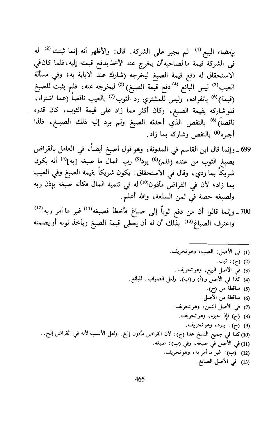 699 - وإنما قال ابن القاسم في المدونة، وهو قول أصبغ أيضًا، في العامل بالقراض يصبغ الثوب من عنده (فلم) (6) يود (¬9) رب المال ما صبغه [به] (5) أنه يكون شريكًا بما ودي، وقال في الاستحقاق: يكون شريكًا بقيمة الصبغ وفي العيب بما زاد؛ لأن في القراض مأذون (¬10) له في تنمية المال فكأنه صبغه بإِذن ربه ولصبغه حصة في ثمن السلعة، والله أعلم.