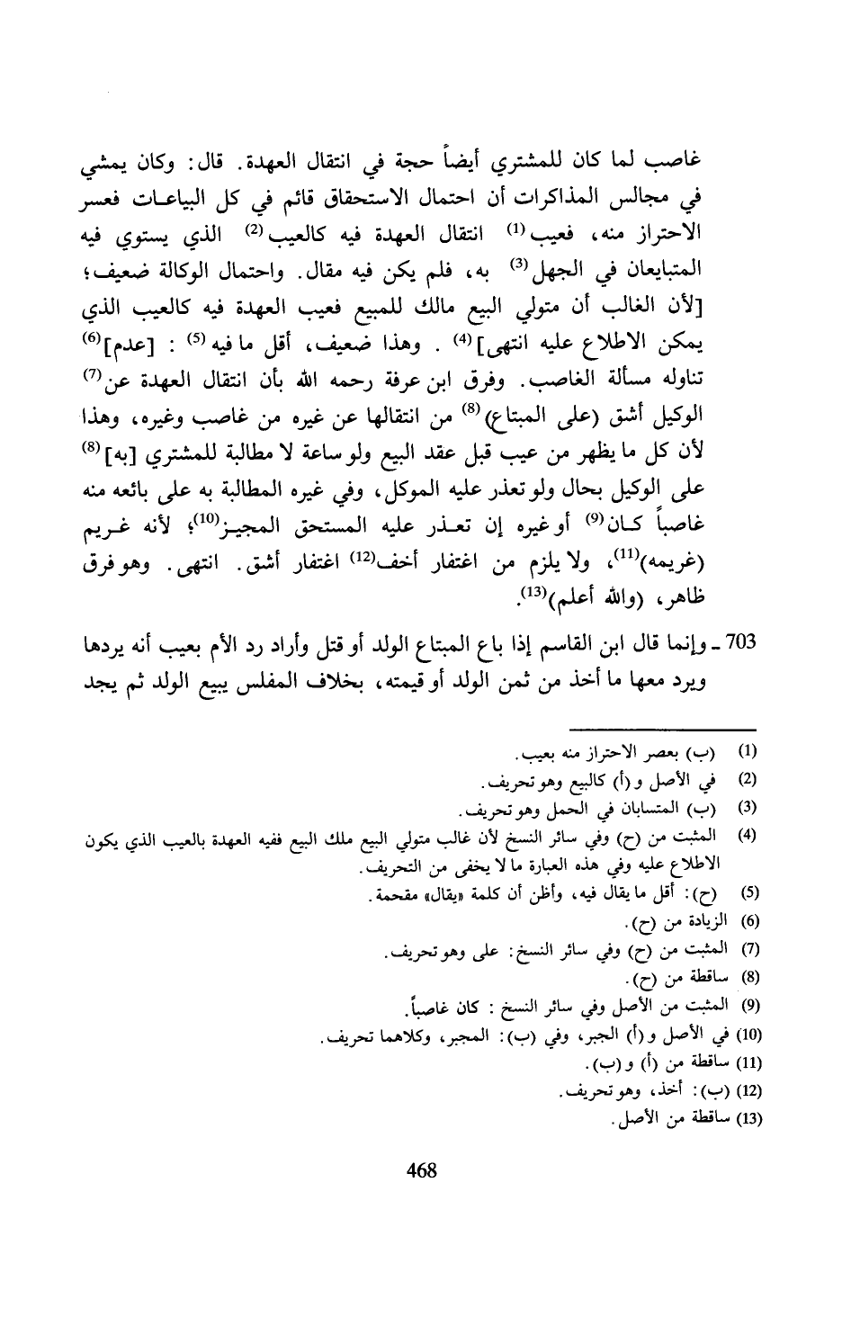 703 - وإنما قال ابن القاسم إذا باع المبتاع الولد أو قتل وأراد رد الأم بعيب أنه يردها ويرد معها ما أخذ من ثمن الولد أو قيمته، بخلاف المفلس يبيع الولد ثم يجد