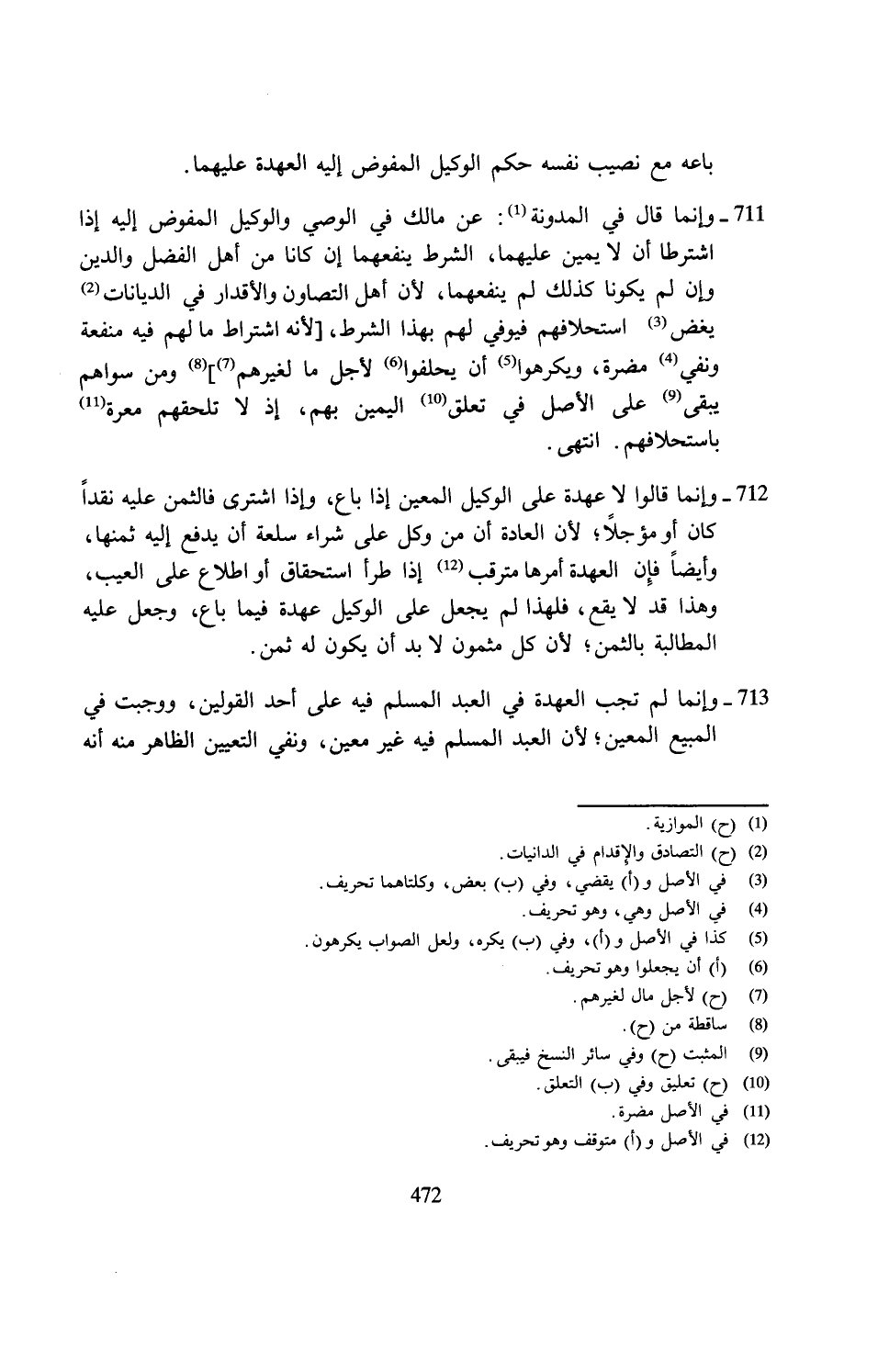 712 - وإنما قالوا لا عهدة على الوكيل المعين إذا باع، وإذا اشتري فالثمن عليه نقدًا كان أو مؤجلًا؛ لأن العادة أن من وكل على شراء سلعة أن يدفع إليه ثمنها، وأيضًا فإِن العهدة أمرها مترقب (¬12) إذا طرأ استحقاق أو اطلاع على العيب، وهذا قد لا يقع، فلهذالم يجعل على الوكيل عهدة فيما باع، وجعل عليه المطالبة بالثمن؛ لأن كل مثمون لا بد أن يكون له ثمن.