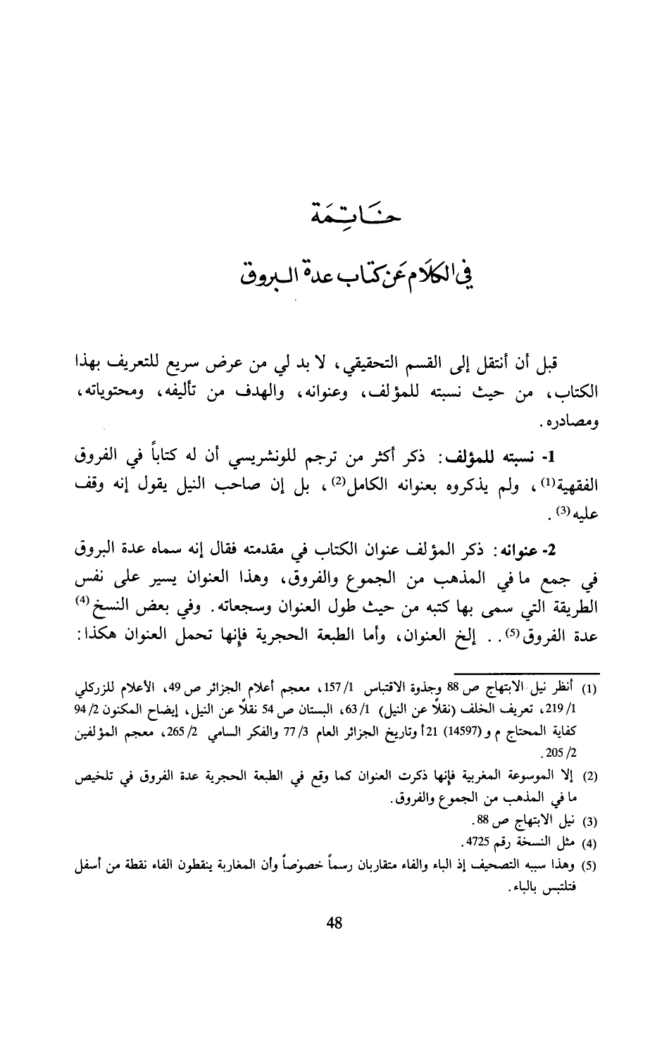 خَاتِمَة في الكلَام عَن كتاب عدة البروق