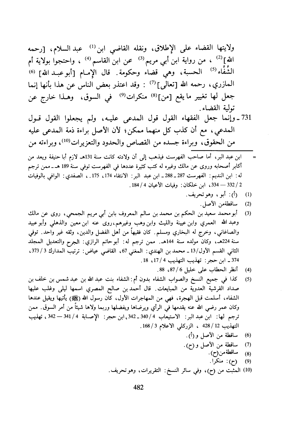 ولايتها القضاء على الإطلاق، ونقله القاضي ابن (¬1) عبد السلام، أرحمه الله، (¬2)، من رواية ابن أبي مريم (¬3) عن ابن القاسم (¬4)، واحتجوا بولاية أم الشَّفَّاء (¬5) الحسبة، وهي قضاء وحكومة. قال الإِمام [أبو عبد الله] (¬6) المازري، رحمه الله [تعالى] (¬7): وقد اعتذر بعض الناس عن هذا بأنها إنما جعل لها تغيير ما يقع [من] (¬8) منكرات (¬9) في السوق، وهذا خارج عن تولية القضاء.
