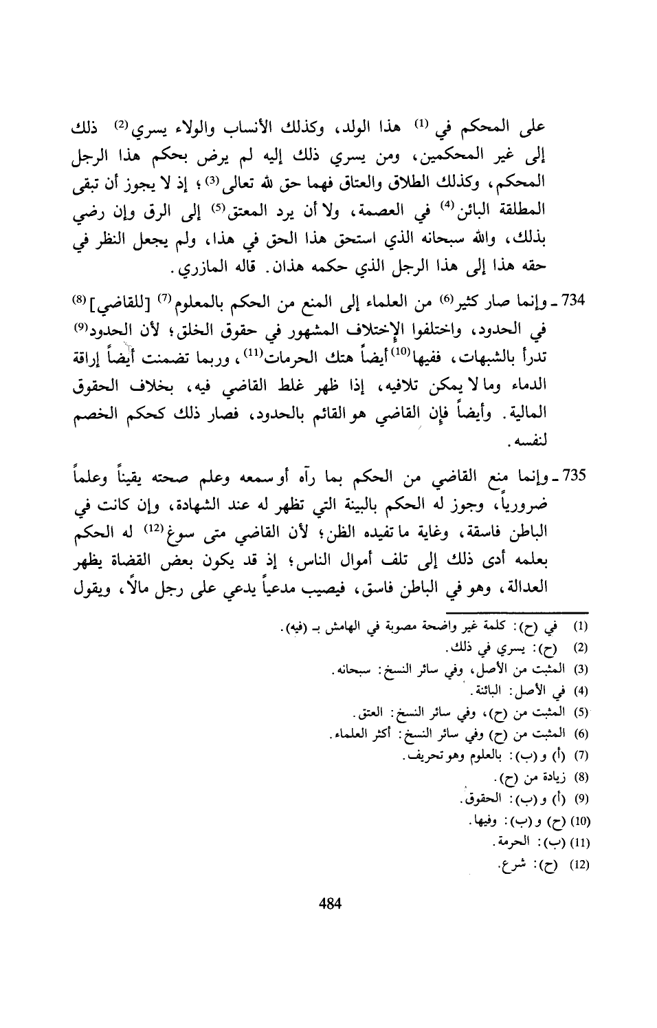 734 - وإنما صار كثير (¬6) من العلماء إلى المنع من الحكم بالمعلوم (¬7) [للقاضي] (¬8) في الحدود، واختلفوا الاختلاف المشهور في حقوق الخلق؛ لأن الحدود (¬9) تدرأ بالشبهات، ففيها (¬10) أيضًا هتك الحرمات (¬11)، وربما تضمنت أيضًا إراقة الدماء وما لا يمكن تلافيه، إذا ظهر غلط القاضي فيه، بخلاف الحقوق المالية. وأيضًا فإِن القاضي هو القائم بالحدود، فصار ذلك كحكم الخصم لنفسه.