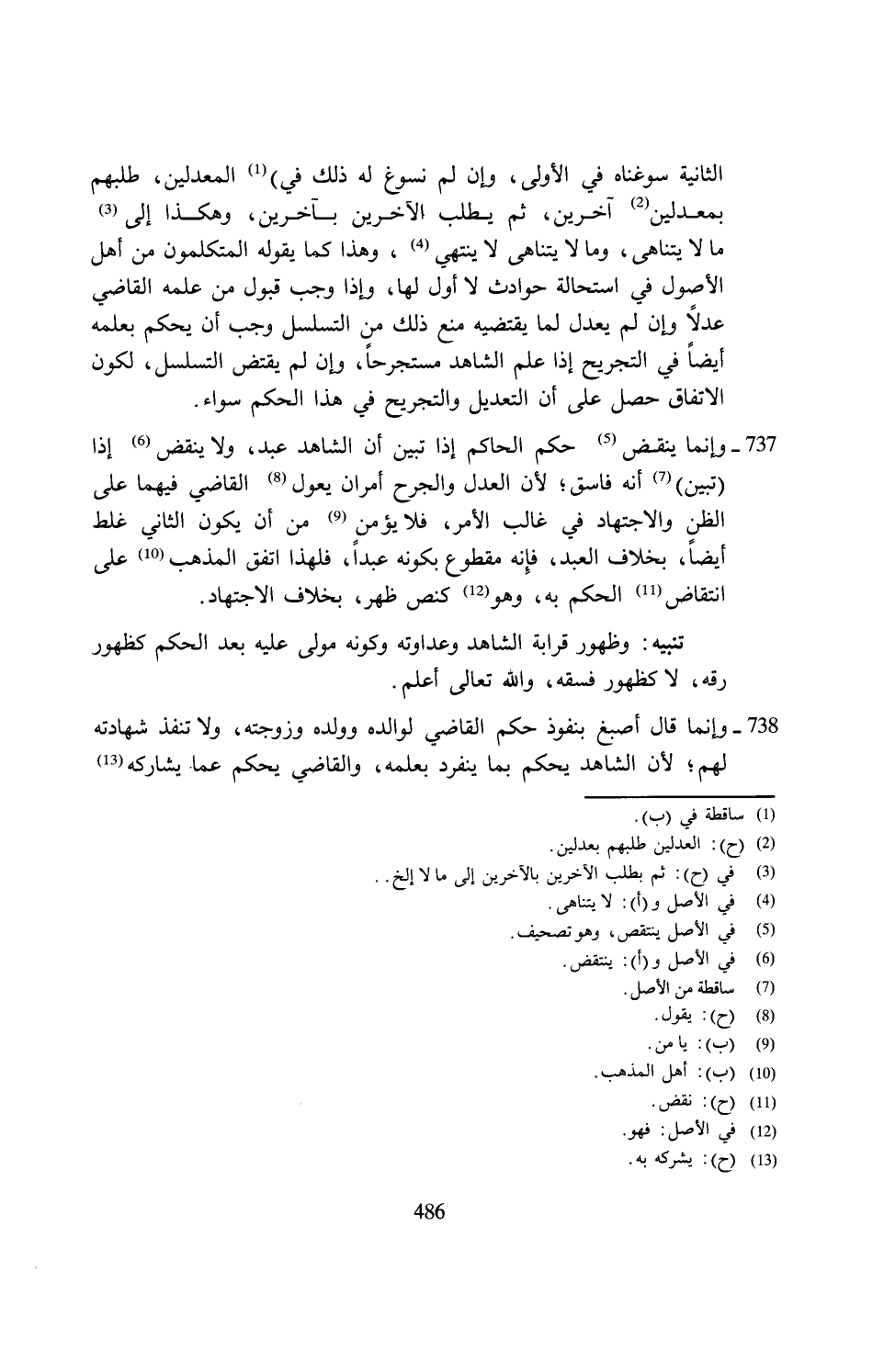 738 - وإنما قال أصبغ بنفوذ حكم القاضي لوالده وولده وزوجته، ولا تنفذ شهادته لهم؛ لأن الشاهد يحكم بما ينفرد بعلمه، والقاضي يحكم عما يشاركه (¬13)
