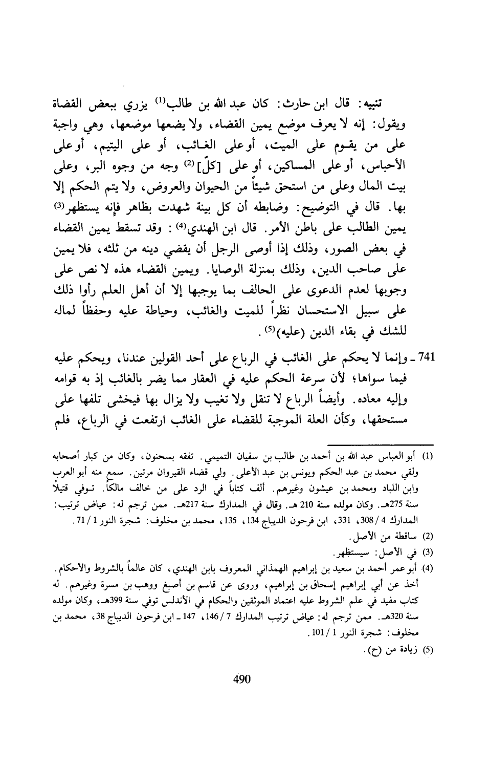 تنبيه: قال ابن حارث: كان عبد الله بن طالب (¬1) يزري ببعض القضاة ويقول: إِنه لا يعرف موضع يمين القضاء، ولا يضعها موضعها، وهي واجبة على من يقوم على الميت، أو على الغائب، أو على اليتيم، أو على الأحباس، أو على المساكين، أو على [كل] (¬2) وجه من وجوه البر، وعلى بيت المال وعلى من استحق شيئًا من الحيوان والعروض، ولا يتم الحكم إلا بها. قال في التوضيح: وضابطه أن كل بينة شهدت بظاهر فإِنه يستظهر (¬3) يمين الطالب على باطن الأمر. قال ابن الهندي (¬4): وقد تسقط يمين القضاء في بعض الصور، وذلك إذا أوصى الرجل أن يقضي دينه من ثلثه، فلا يمين على صاحب الدين، وذلك بمنزلة الوصايا. ويمين القضاء هذه لا نص على وجوبها لعدم الدعوى على الحالف بما يوجبها إلا أن أهل العلم رأوا ذلك على سبيل الاستحسان نظرًا للميت والغائب، وحياطة عليه وحفظًا لمال، للشك في بقاء الدين (عليه) (¬5).