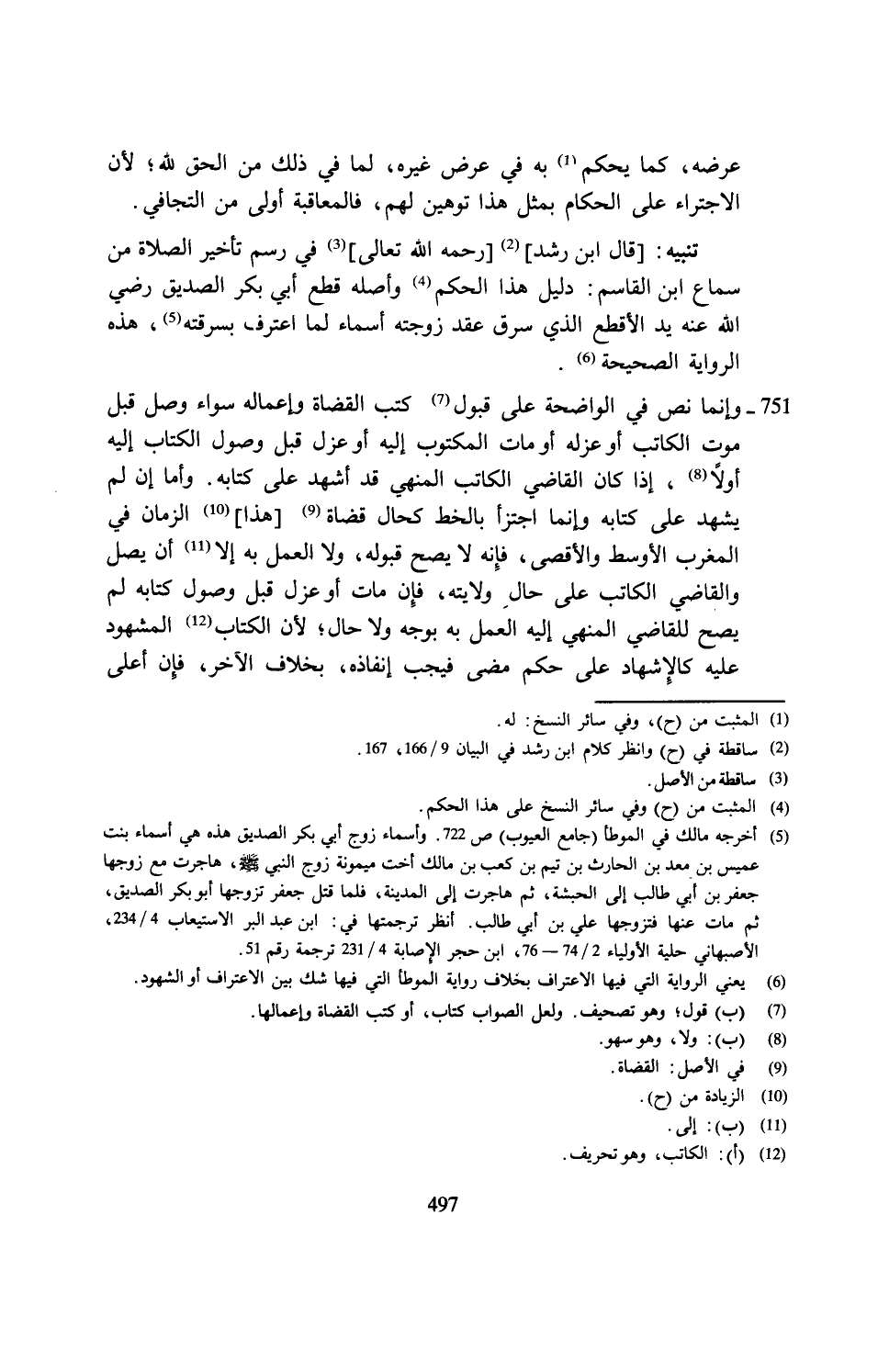 تنبيه: [قال ابن رشد] (¬2) [رحمه الله تعالى] (¬3) في رسم تأخير الصلاة من سماع ابن القاسم: دليل هذا الحكم (¬4) وأصله قطع أبي بكر الصديق رضي الله عنه يد الأقطع الذي سرق عقد زوجته أسماء لما اعترف بسرقته (¬5)، هذه الرواية الصحيحة (¬6).